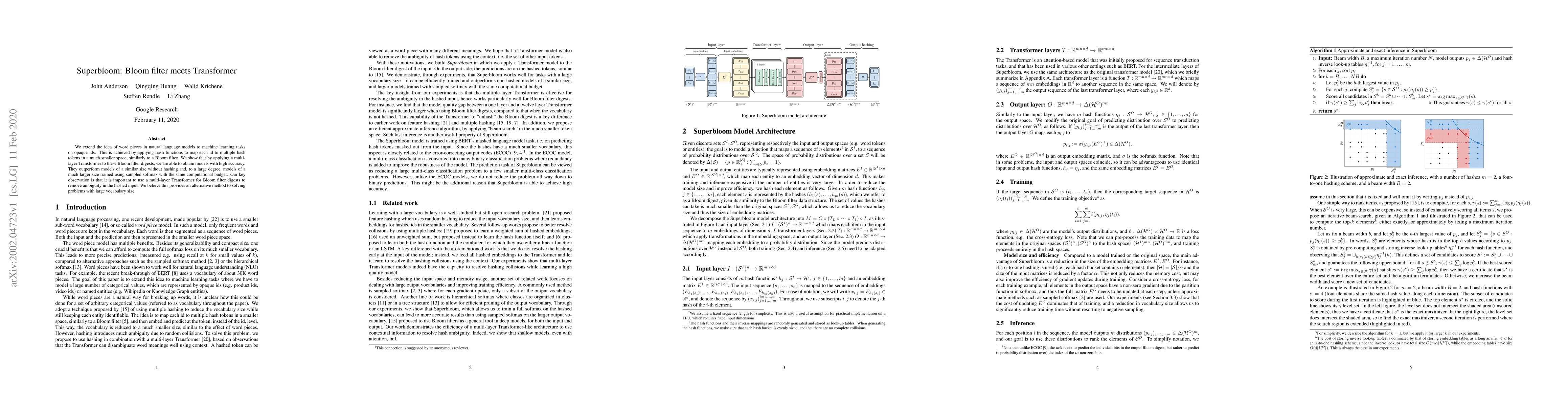 Title: Superbloom: Bloom filter meets Transformer Summary: This paper proposes using Bloom filter digests with a multi-layer Transformer to handle large vocabulary size in machine learning tasks. The approach achieves high accuracy and outperforms similar or larger models, demonstrating the effectiveness of combining Bloom filters with Transformers.