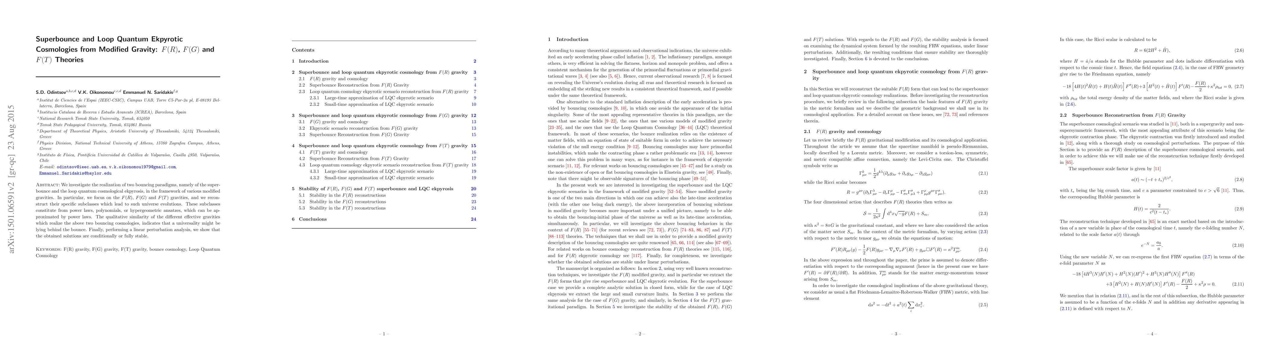 This paper explores the superbounce and loop quantum ekpyrotic cosmologies within modified gravity theories, specifically $F(R)$, $F(G)$, and $F(T)$ gravities. It identifies subclasses leading to these bouncing universe models and finds a universality in their realization, concluding with stability analysis of the solutions.