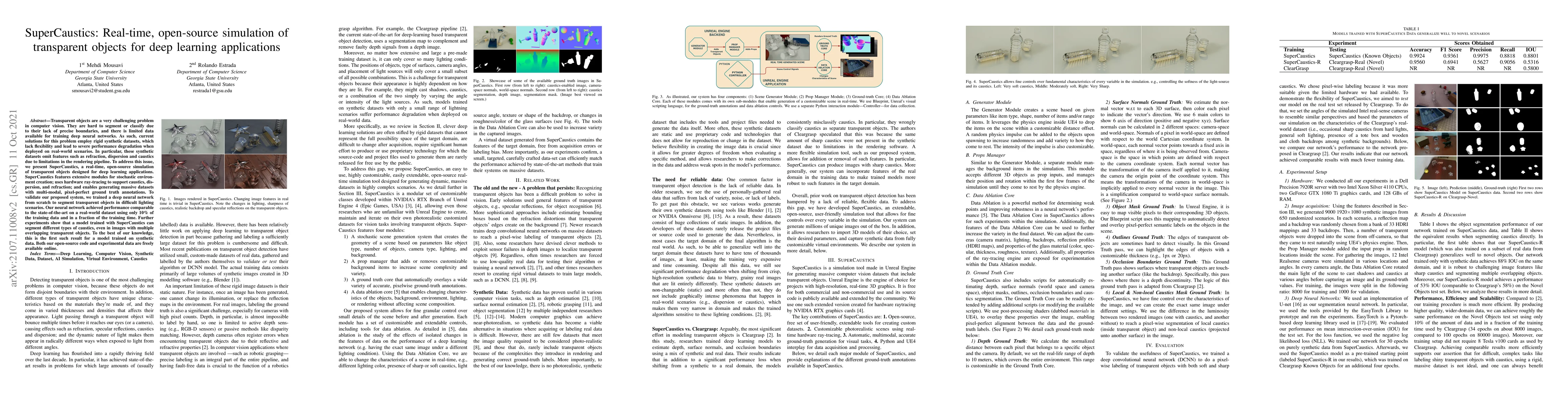 The research presents SuperCaustics, an open-source simulation tool built on Unreal Engine for generating massive computer vision datasets involving transparent objects. It features customizable photorealistic scenes using real-time hardware ray-tracing and automatic, multimodal, accurate ground-truth generation for visual tasks.