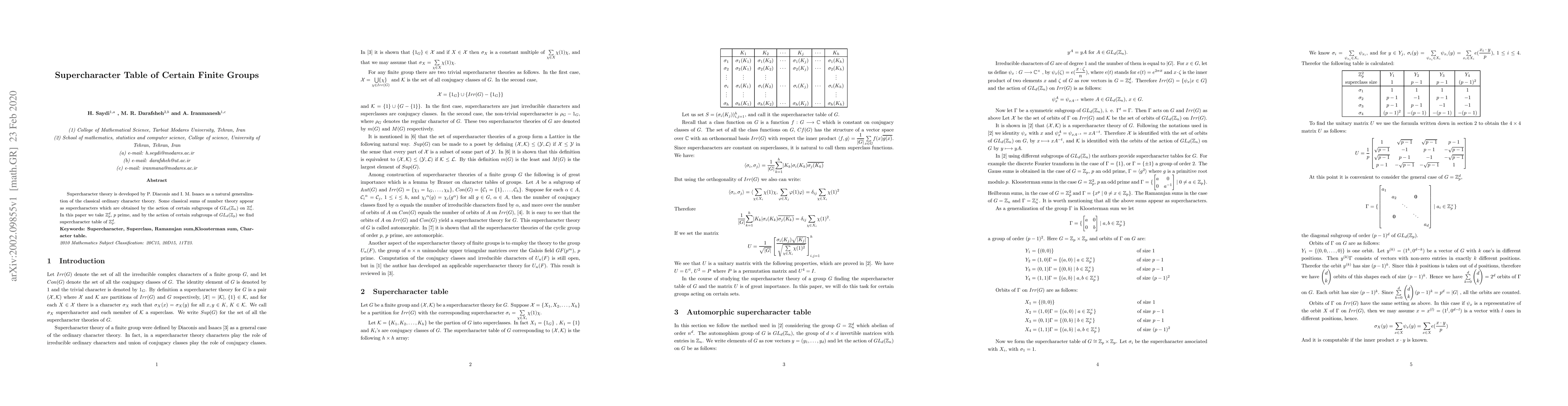 Supercharacter theory is developed by P. Diaconis and I. M. Isaacs as a natural generalization of the classical ordinary character theory. Some classical sums of number theory appear as supercharacters which are obtained by the action of certain subgroups of GLd(Zn) on Zdn. In this paper we take Zdp , p prime, and by the action of certain subgroups of GLd(Zp) we find supercharacter table of Zdp .