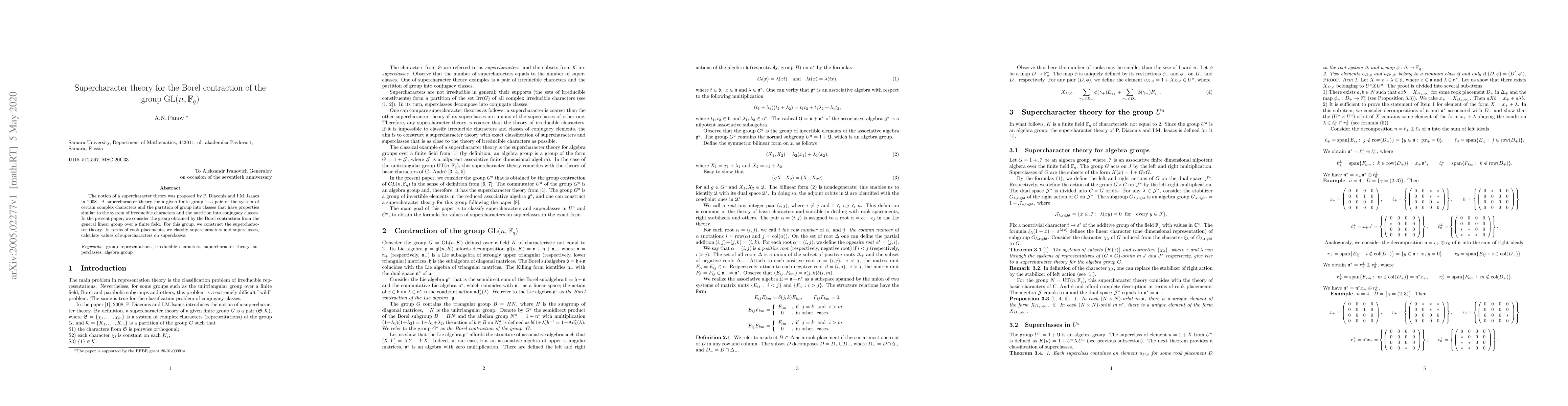 The notion of a supercharacter theory was proposed by P. Diaconis and I.M. Isaacs in 2008. A supercharacter theory for a given finite group is a pair of the system of certain complex characters and the partition of group into classes that have properties similar to the system of irreducible characters and the partition into conjugacy classes. In the present paper, we consider the group obtained by the Borel contraction from the general linear group over a finite field. For this group, we construct the supercharacter theory. In terms of rook placements, we classify supercharacters and superclasses, calculate values of supercharacters on superclasses