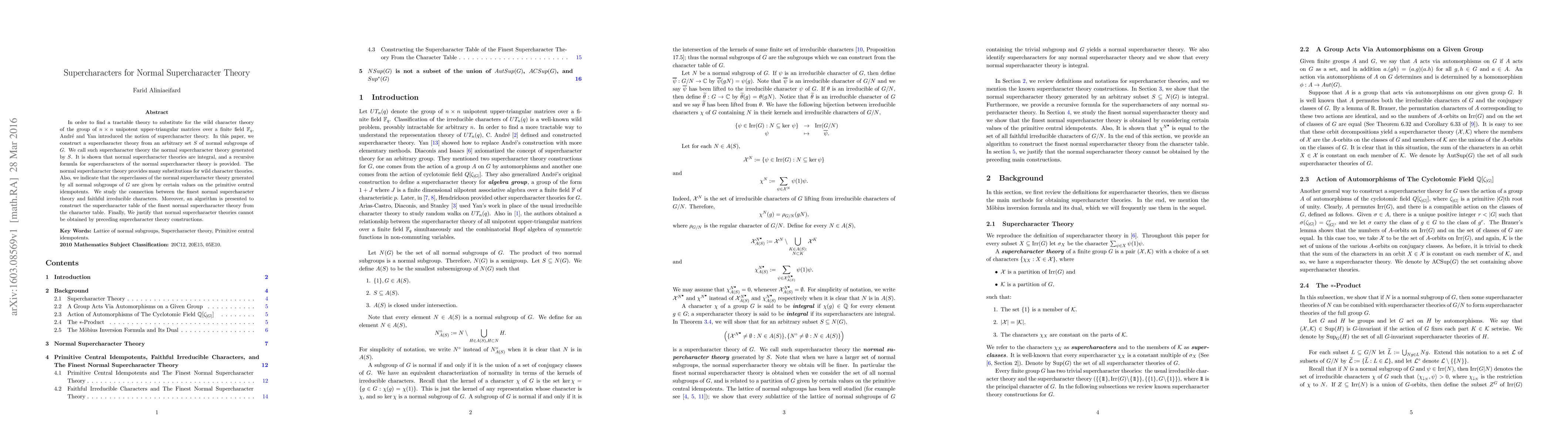 This paper constructs a normal supercharacter theory from an arbitrary set of normal subgroups of a group, providing a tractable alternative to wild character theory. It shows that these normal supercharacter theories are integral and presents a recursive formula for supercharacters, along with an algorithm for constructing the supercharacter table.