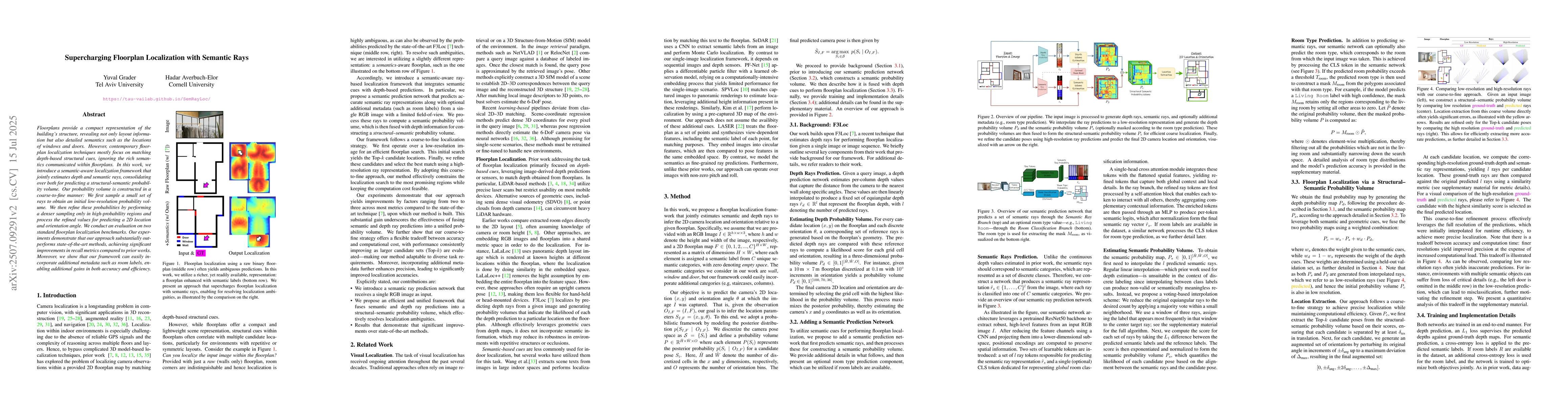 This research introduces a semantic-aware floorplan localization framework that combines depth and semantic ray estimation for improved accuracy. The method creates a coarse-to-fine probability volume, refining it in high-probability regions for precise 2D location and orientation angle prediction. Experiments show significant performance gains over existing methods, especially in recall, and the framework's flexibility in incorporating metadata like room labels for further enhancement.