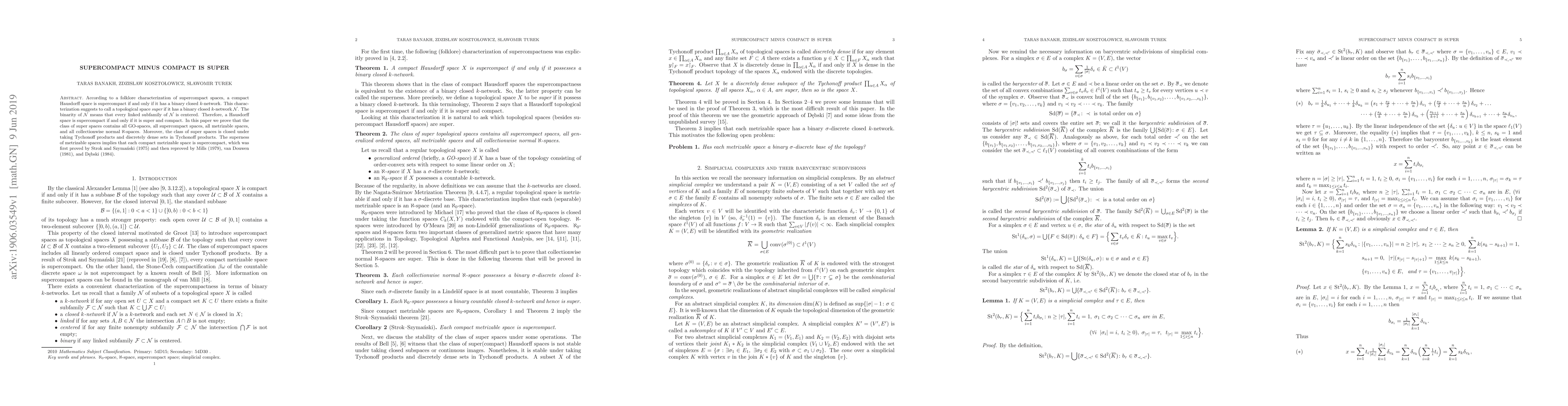 According to a folklore characterization of supercompact spaces, a compact Hausdorff space is supercompact if and only if it has a binary closed $k$-network. This characterization suggests to call a topological space $super$ if it has a binary closed $k$-network $\mathcal N$. The binarity of $\mathcal N$ means that every linked subfamily of $\mathcal N$ is centered. Therefore, a Hausdorff space is supercompact if and only if it is super and compact. In this paper we prove that the class of super spaces contains all GO-spaces, all supercompact spaces, all metrizable spaces, and all collectionwise normal $\aleph$-spaces. Moreover, the class of super spaces is closed under taking Tychonoff products and discretely dense sets in Tychonoff products. The superness of metrizable spaces implies that each compact metrizable space is supercompact, which was first proved by Strok and Szyma\'nski (1975) and then reproved by Mills (1979), van Douwen (1981), and D{\c e}bski (1984).