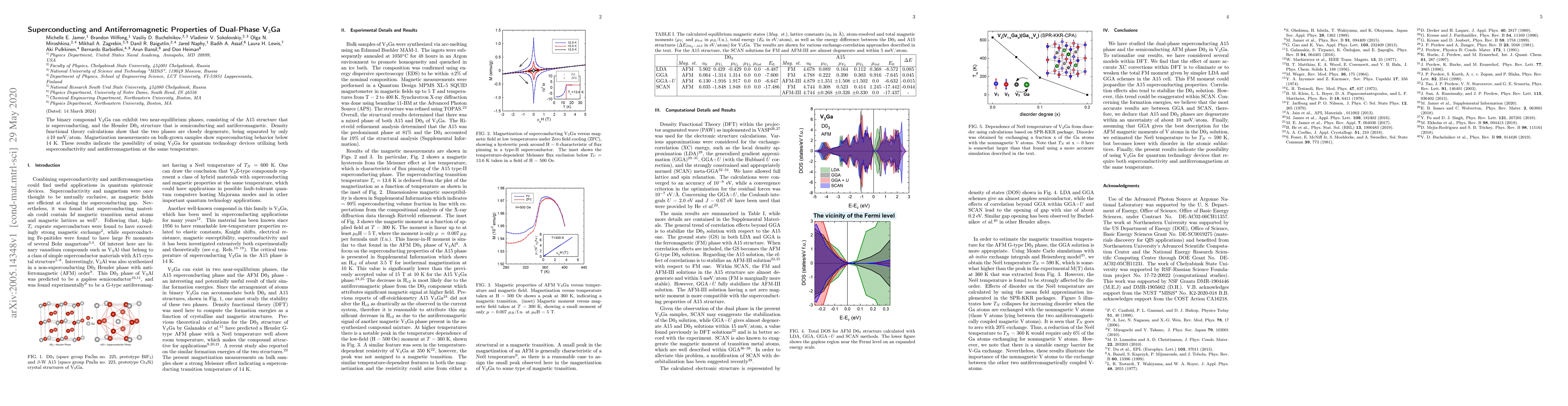 The binary compound V$_3$Ga can exhibit two near-equilibrium phases, consisting of the A15 structure that is superconducting, and the Heusler D0$_3$ structure that is semiconducting and antiferromagnetic. Density functional theory calculations show that the two phases are closely degenerate, being separated by only ~10 meV/atom. Magnetization measurements on bulk-grown samples show superconducting behavior below 14 K. These results indicate the possibility of using V$_3$Ga for quantum technology devices utilizing both superconductivity and antiferromagnetism at the same temperature.