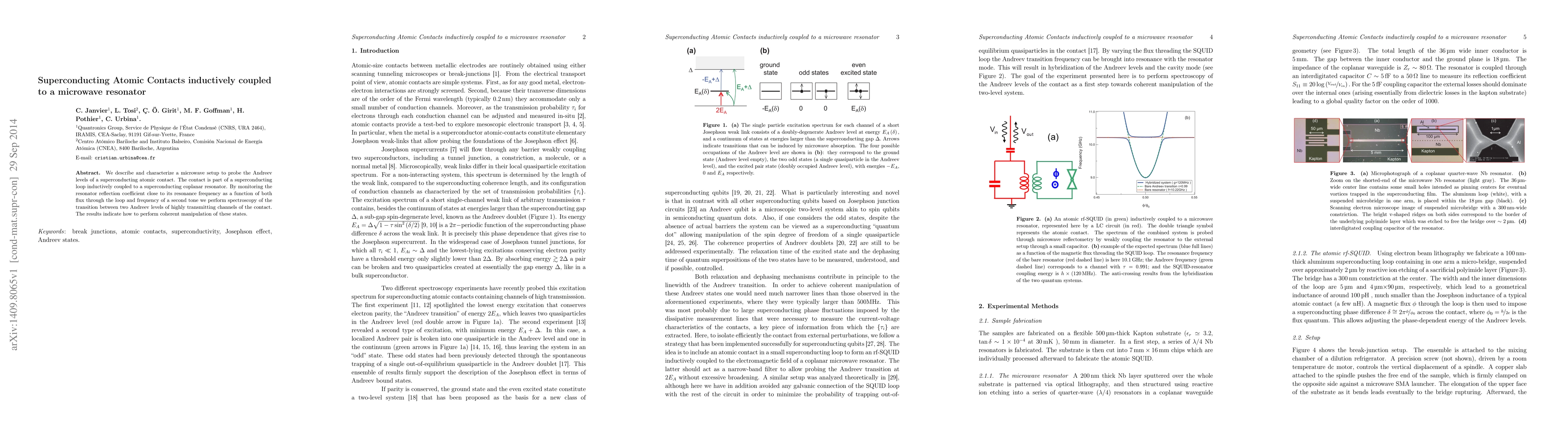 This paper details a microwave setup to study the Andreev levels in a superconducting atomic contact, which is inductively coupled to a resonator. Spectroscopy of the transition between Andreev levels is performed, revealing methods for coherent manipulation of these states.