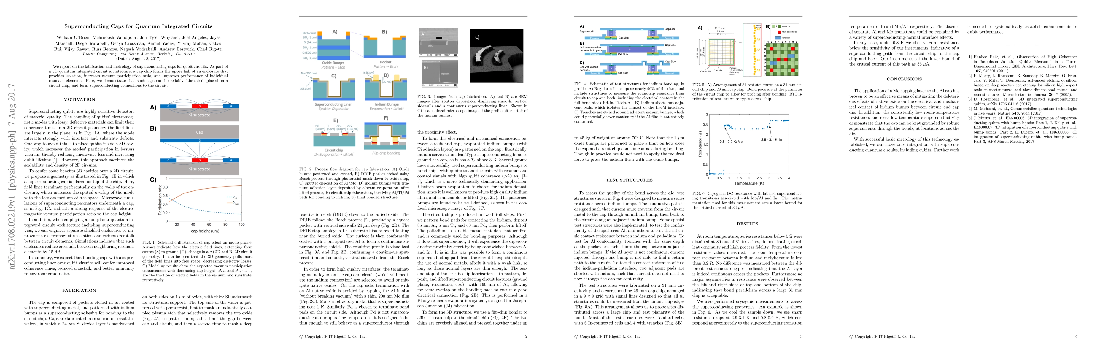 We report on the fabrication and metrology of superconducting caps for qubit circuits. As part of a 3D quantum integrated circuit architecture, a cap chip forms the upper half of an enclosure that provides isolation, increases vacuum participation ratio, and improves performance of individual resonant elements. Here, we demonstrate that such caps can be reliably fabricated, placed on a circuit chip, and form superconducting connections to the circuit.