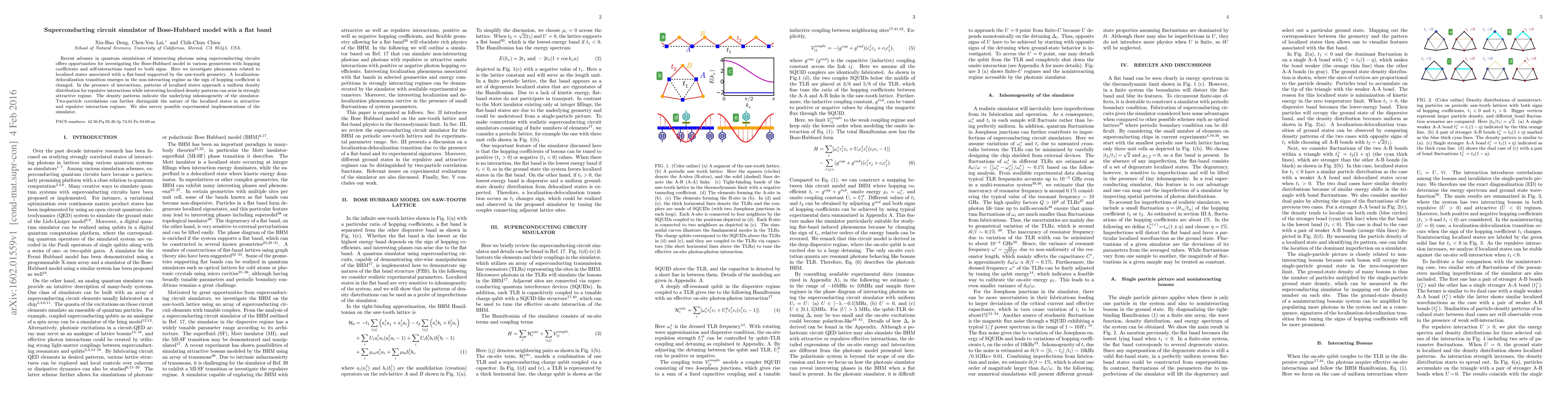 Recent advance in quantum simulations of interacting photons using superconducting circuits offers opportunities for investigating the Bose-Hubbard model in various geometries with hopping coefficients and self-interactions tuned to both signs. Here we investigate phenomena related to localized states associated with a flat-band supported by the saw-tooth geometry. A localization-delocalization transition emerges in the non-interacting regime as the sign of hopping coefficient is changed. In the presence of interactions, patterns of localized states approach a uniform density distribution for repulsive interactions while interesting localized density patterns can arise in strongly attractive regime. The density patterns indicate the underlying inhomogeneity of the simulator. Two-particle correlations can further distinguish the nature of the localized states in attractive and repulsive interaction regimes. We also survey possible experimental implementations of the simulator.
