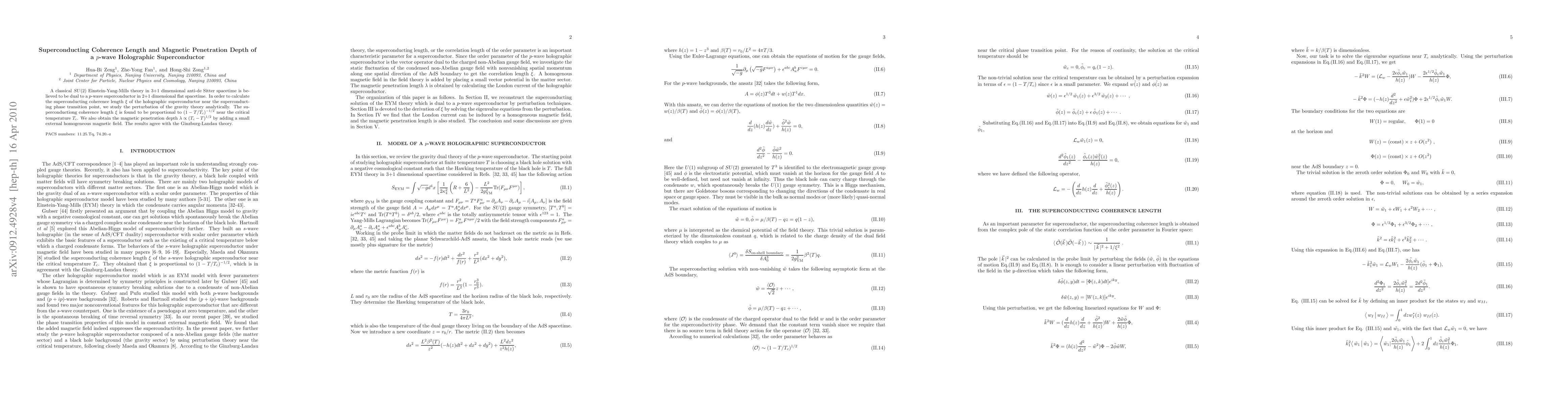 This paper investigates a p-wave holographic superconductor using SU(2) Einstein-Yang-Mills theory in 3+1 dimensions. It finds that the superconducting coherence length $\xi$ scales as $(1-T/T_c)^{-1/2}$ near the critical temperature, while the magnetic penetration depth $\lambda$ scales as $(T_c-T)^{1/2}$ under a small external magnetic field, confirming predictions from the Ginzburg-Landau theory.