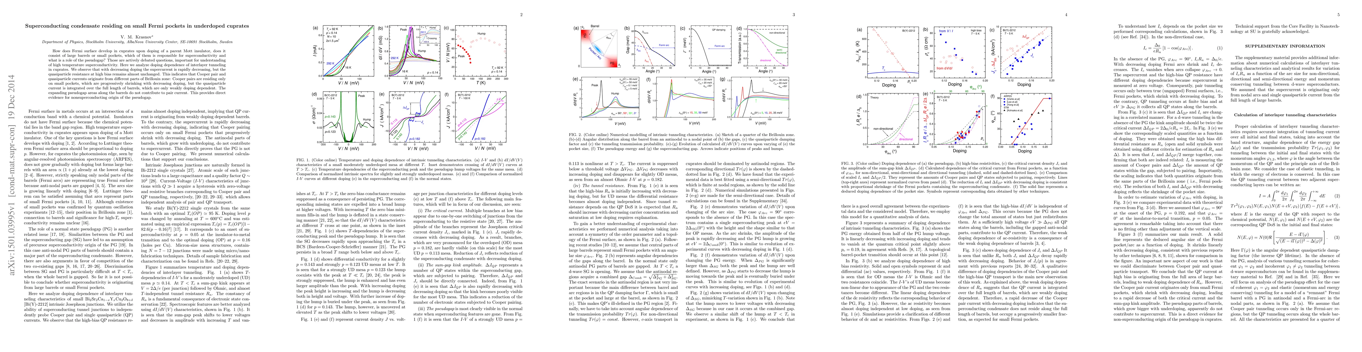 How does Fermi surface develop in cuprates upon doping of a parent Mott insulator, does it consist of large barrels or small pockets, which of them is responsible for superconductivity and what is a role of the pseudogap? Those are actively debated questions, important for understanding of high temperature superconductivity. Here we analyze doping dependence of interlayer tunneling in cuprates. We observe that with decreasing doping the supercurrent is rapidly decreasing, but the quasiparticle resistance at high bias remains almost unchanged. This indicates that Cooper pair and quasiparticle currents originate from different parts of Brillouin zone: Cooper pairs are residing only on small pockets, which are progressively shrinking with decreasing doping, but the quasiparticle current is integrated over the full length of barrels, which are only weakly doping dependent. The expanding pseudogap areas along the barrels do not contribute to pair current. This provides direct evidence for nonsuperconducting origin of the pseudogap.