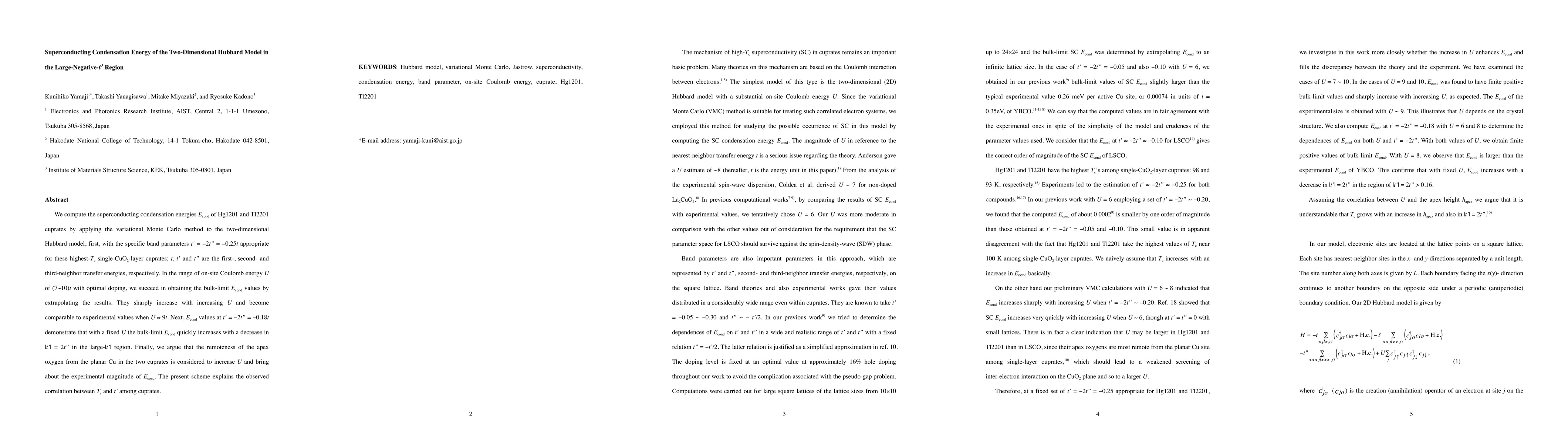 Researchers used a computational method to study the superconducting properties of two-dimensional Hubbard model in cuprates, finding that bulk-limit condensation energy increases with on-site Coulomb energy U and decreases with t'.