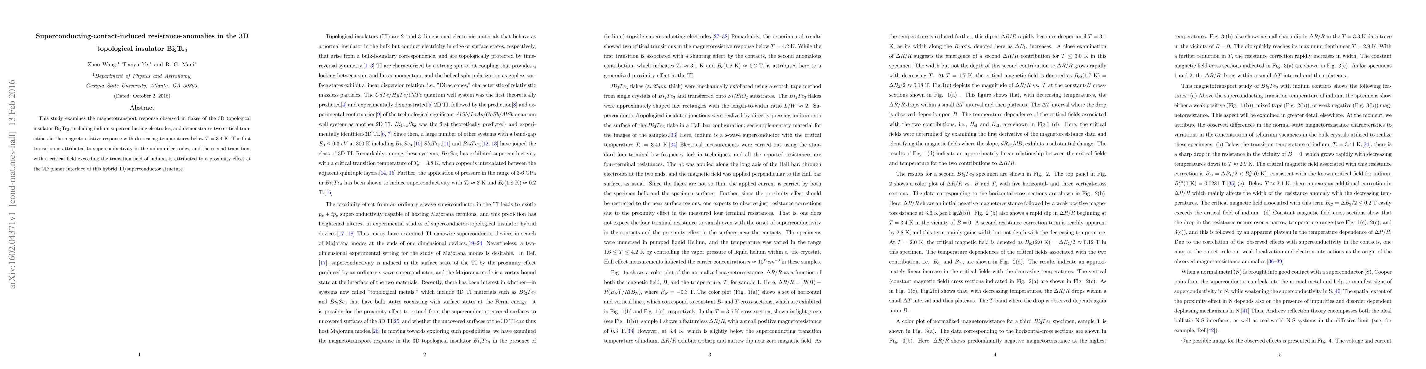 This study examines the magnetotransport response observed in flakes of the 3D topological insulator (TI) Bi2Te3, including indium superconducting electrodes, and demonstrates two critical transitions in the magnetoresistive response with decreasing temperatures below T = 3.4K. The first transition is attributed to superconductivity in the indium electrodes, and the second transition, with a critical field exceeding the transition field of indium, is attributed to a proximity effect at the 2D planar interface of this hybrid TI/superconductor structure.