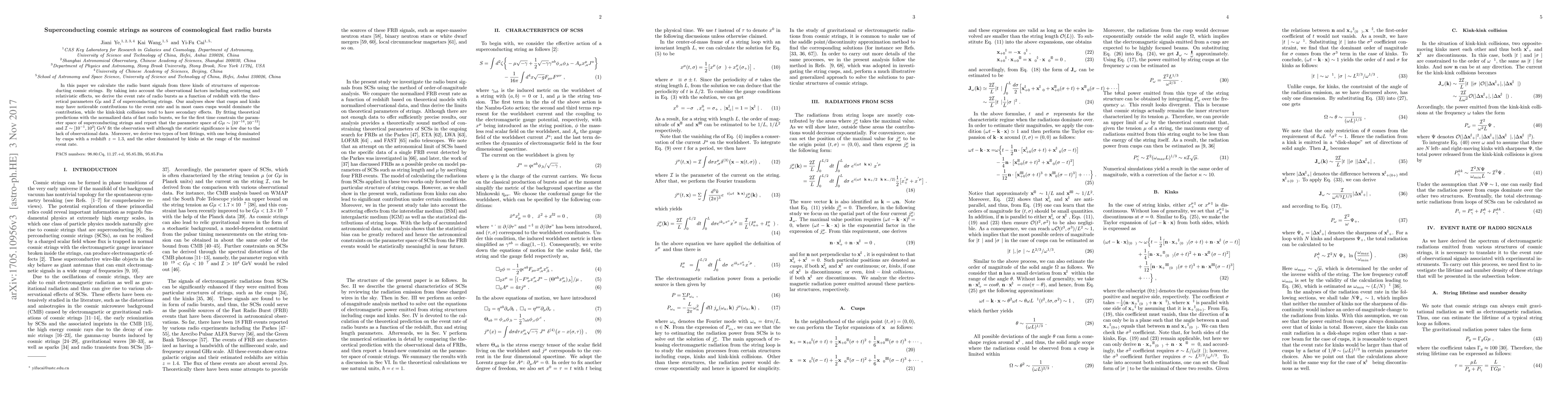 This paper investigates radio burst signals from superconducting cosmic strings, finding that cusps dominate the event rate, while kink-kink collisions have secondary effects. The study constrains the parameter space of these strings, suggesting a fit within $G\mu \sim [10^{-14}, 10^{-12}]$ and $\mathcal{I} \sim [10^{-1}, 10^{2}] ~ \rm{GeV}$, though with low statistical significance due to limited observational data.
