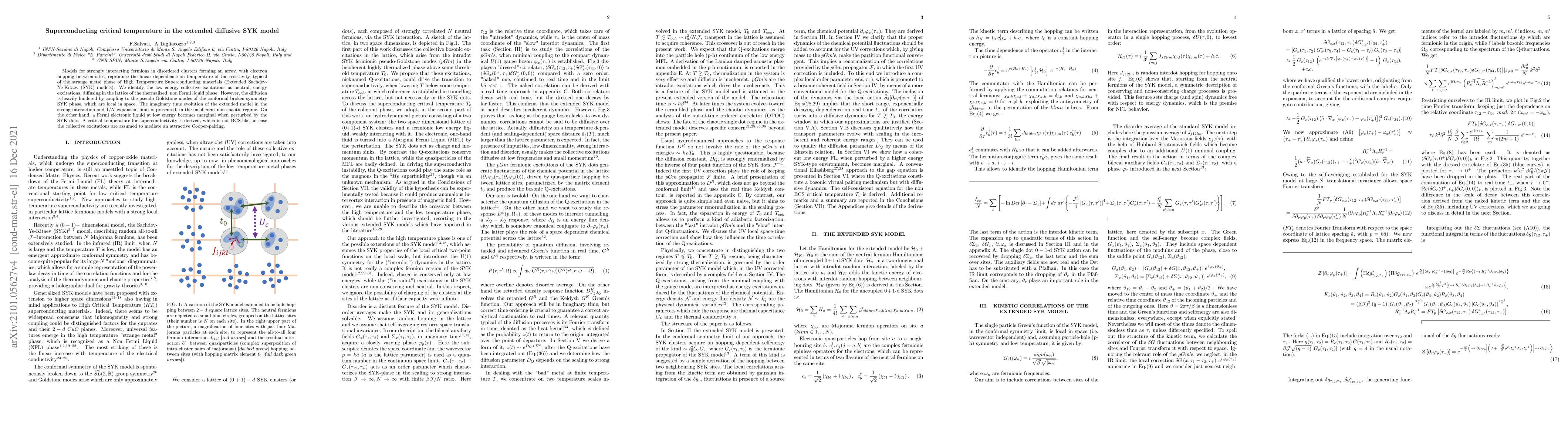 Models for strongly interacting fermions in disordered clusters forming an array, with electron hopping between sites, reproduce the linear dependence on temperature of the resistivity, typical of the strange metal phase of High Temperature Superconducting materials (Extended Sachdev-Ye-Kitaev (SYK) models). Our hydrodynamical approach to the marginal Fermi liquid emerging out of the interaction, identifies the low energy collective excitations of the system in its coherent phase. These neutral excitations diffuse in the lattice, but the diffusion is heavily hindered by coupling to the pseudo Goldstone modes of the conformal broken symmetry SYK phase, which are local in space. A critical temperature for superconductivity arises in the electron liquid,in case these excitations are assumed to mediate an attractive Cooper-pairing, in the electron liquid, which is not BCS-like.