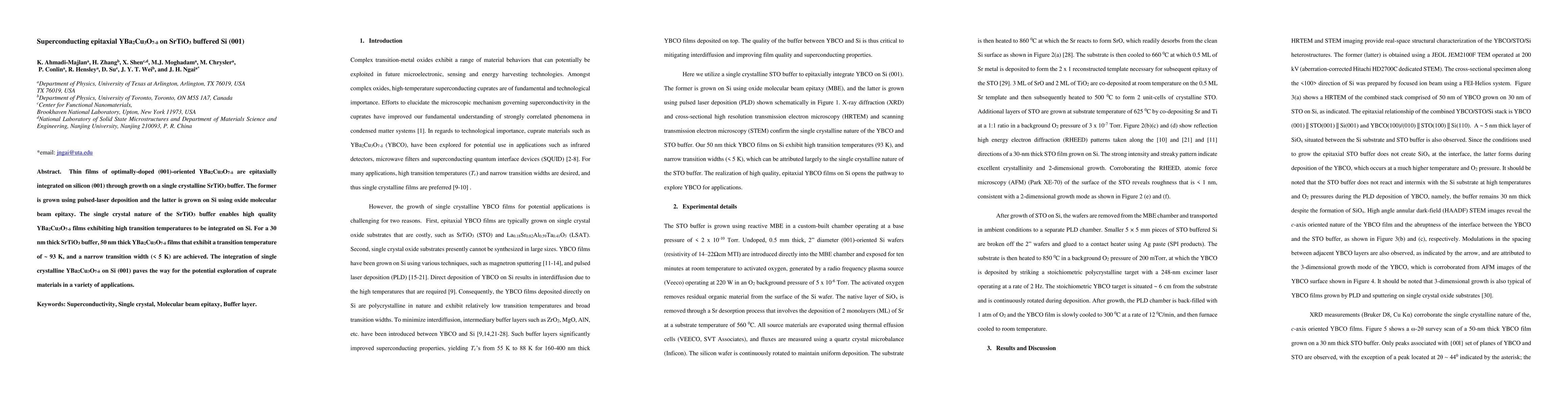 This paper reports on the epitaxial growth of high-quality YBa2Cu3O7-δ superconducting films on silicon substrates using a SrTiO3 buffer, achieving a transition temperature of ~93 K and paving the way for advanced cuprate applications on silicon.