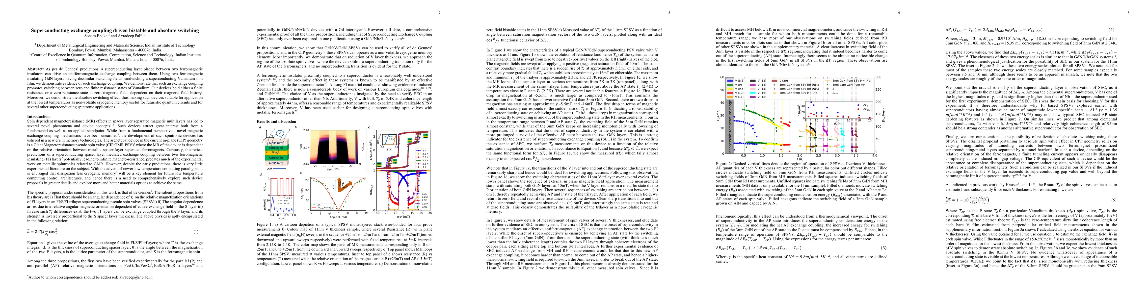 As per de Gennes predictions, a superconducting layer placed between two ferromagnetic insulators can drive an antiferromagnetic exchange coupling between them. Using two ferromagneticinsulating GdN layers having dissimilar switching fields sandwiching a superconducting Vanadium thin film, we demonstrate evidence of such exchange coupling. We demonstrate that such an exchange coupling promotes switching between zero and finite resistance states of Vanadium. Our devices hold either a finite resistance or a zero-resistance state at zero magnetic field, dependent on their magnetic field history. Moreover, we demonstrate the absolute switching effect, thus making such devices suitable for application at the lowest temperatures as non-volatile cryogenic memory useful for futuristic quantum circuits and for several other superconducting spintronic applications.
