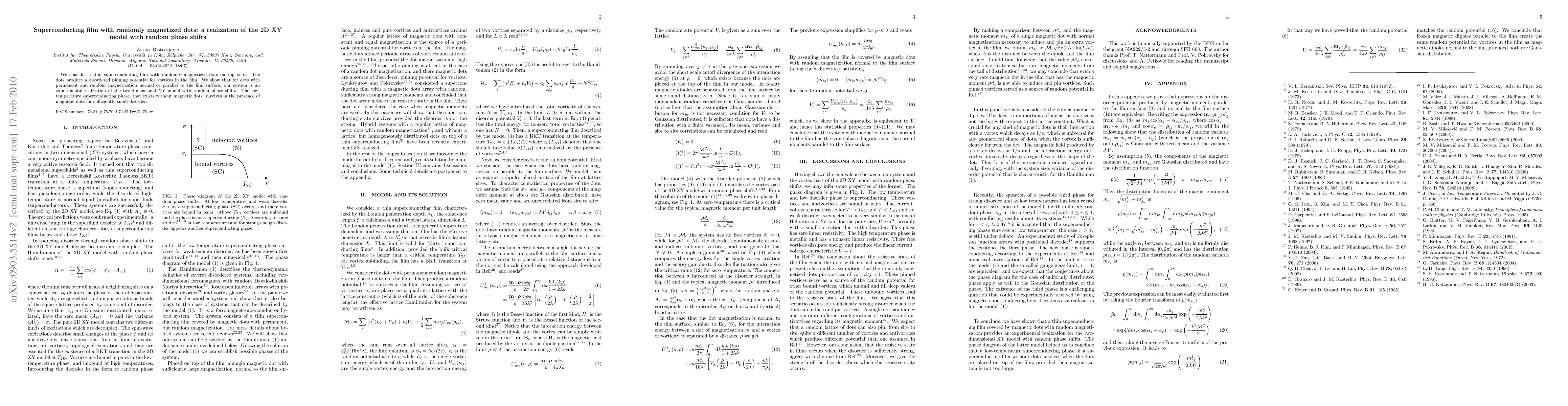 We consider a thin superconducting film with randomly magnetized dots on top of it. The dots produce a disordered pinning potential for vortices in the film. We show that for dots with permanent and random magnetization normal or parallel to the film surface, our system is an experimental realization of the two-dimensional XY model with random phase shifts. The low-temperature superconducting phase, that exists without magnetic dots, survives in the presence of magnetic dots for sufficiently small disorder.