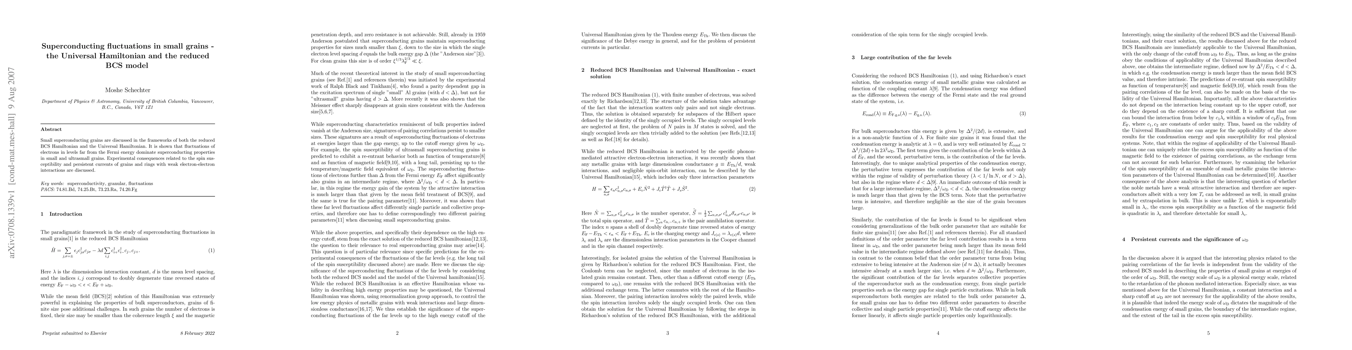 Small superconducting grains are discussed in the frameworks of both the reduced BCS Hamiltonian and the Universal Hamiltonian. It is shown that fluctuations of electrons in levels far from the Fermi energy dominate superconducting properties in small and ultrasmall grains. Experimental consequences related to the spin susceptibility and persistent currents of grains and rings with weak electron-electron interactions are discussed.