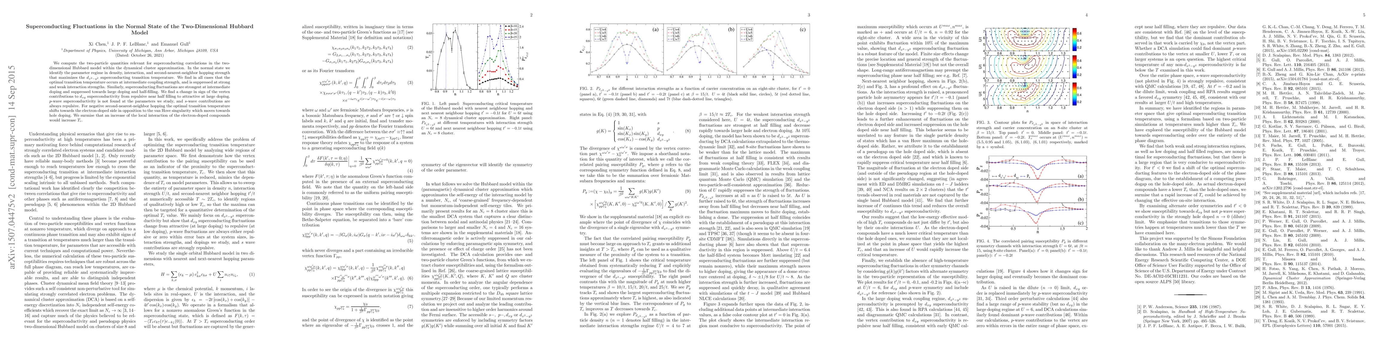 We compute the two-particle quantities relevant for superconducting correlations in the two-dimensional Hubbard model within the dynamical cluster approximation. In the normal state we identify the parameter regime in density, interaction, and second-nearest-neighbor hopping strength that maximizes the $d_{x^2-y^2}$ superconducting transition temperature. We find in all cases that the optimal transition temperature occurs at intermediate coupling strength, and is suppressed at strong and weak interaction strengths. Similarly, superconducting fluctuations are strongest at intermediate doping and suppressed towards large doping and half-filling. We find a change in sign of the vertex contributions to $d_{xy}$ superconductivity from repulsive near half filling to attractive at large doping. $p$-wave superconductivity is not found at the parameters we study, and $s$-wave contributions are always repulsive. For negative second-nearest-neighbor hopping the optimal transition temperature shifts towards the electron-doped side in opposition to the van Hove singularity which moves towards hole doping. We surmise that an increase of the local interaction of the electron-doped compounds would increase $T_c$.