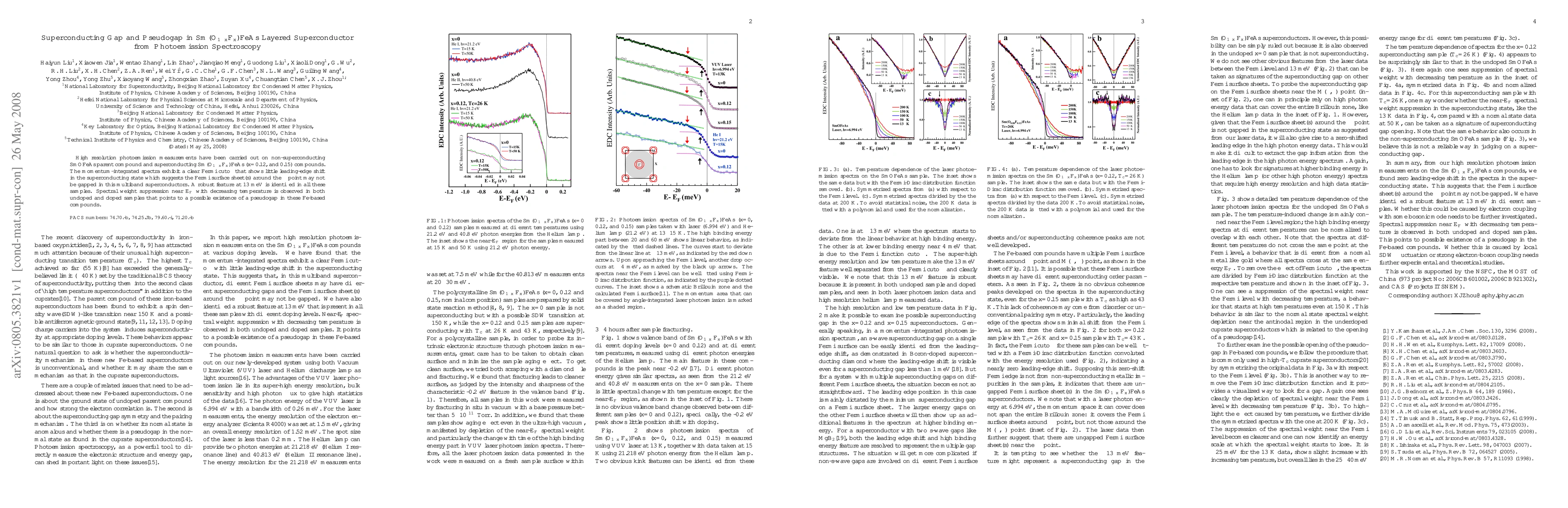 Researchers studied superconducting Sm(O$_{1-x}$F$_x$)FeAs compounds using photoemission spectroscopy, finding a clear Fermi cutoff with no shift in the superconducting state, suggesting some Fermi surface sheets may not be gapped. A robust feature at 13 meV and temperature-dependent spectral weight suppression near E$_F$ suggest a pseudogap in these Fe-based compounds.