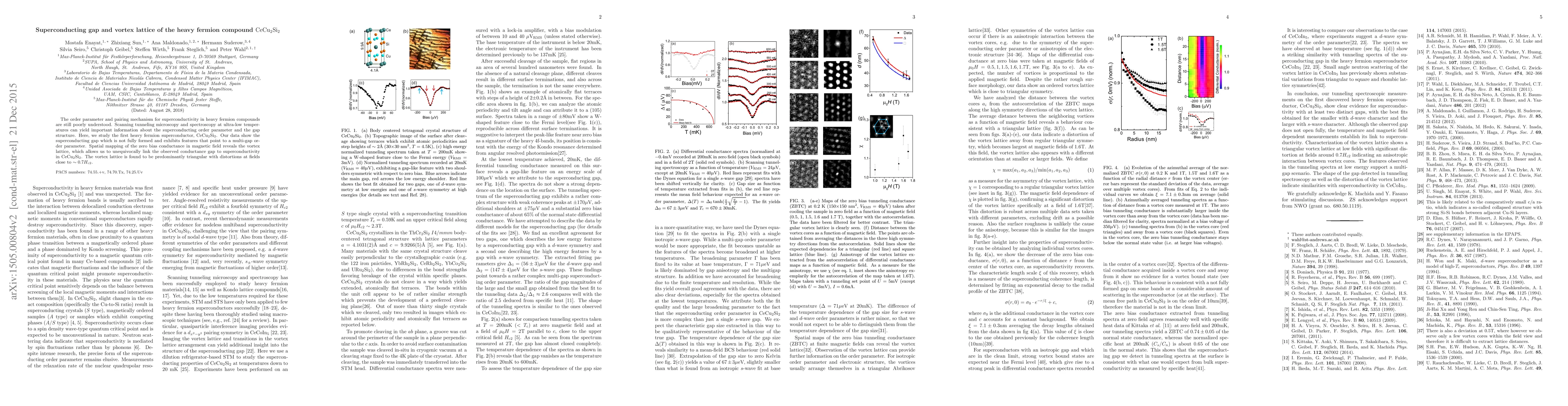 Researchers studied CeCu_2Si_2, a heavy fermion superconductor, using scanning tunneling microscopy to reveal an incomplete superconducting gap with a multi-gap order parameter. The study also mapped the vortex lattice in magnetic fields, showing predominantly triangular structures with distortions at high fields.