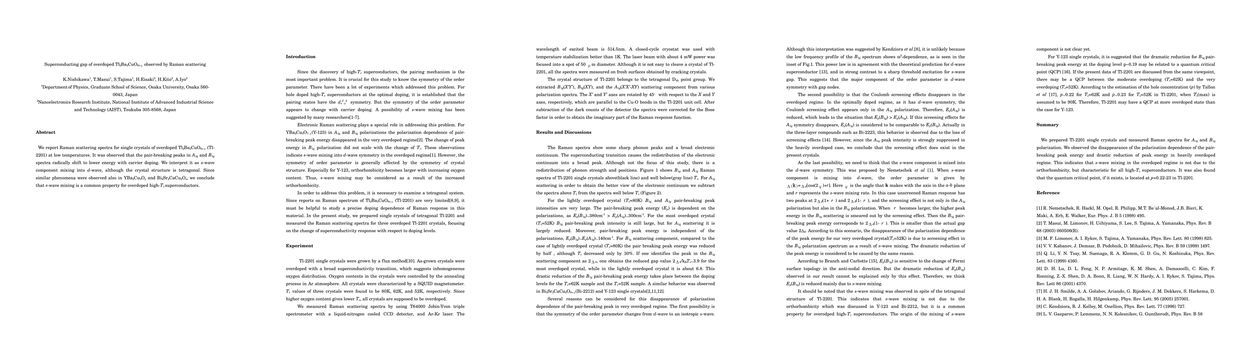Researchers observed a shift in Raman scattering spectra for overdoped Tl2Ba2CuO6+d to lower energy with increasing carrier doping, suggesting s-wave component mixing into d-wave states.
