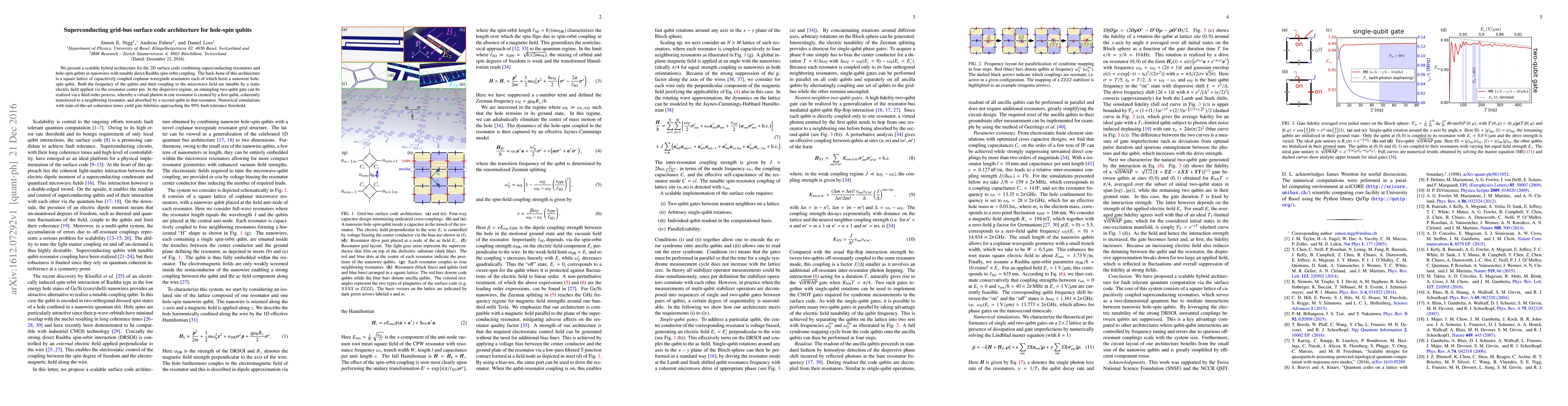 We present a scalable hybrid architecture for the 2D surface code combining superconducting resonators and hole-spin qubits in nanowires with tunable direct Rashba spin-orbit coupling. The back-bone of this architecture is a square lattice of capacitively coupled coplanar waveguide resonators each of which hosts a nanowire hole-spin qubit. Both the frequency of the qubits and their coupling to the microwave field are tunable by a static electric field applied via the resonator center pin. In the dispersive regime, an entangling two-qubit gate can be realized via a third order process, whereby a virtual photon in one resonator is created by a first qubit, coherently transferred to a neighboring resonator, and absorbed by a second qubit in that resonator. Numerical simulations with state-of-the-art coherence times yield gate fidelities approaching the $99\%$ fault tolerance threshold.