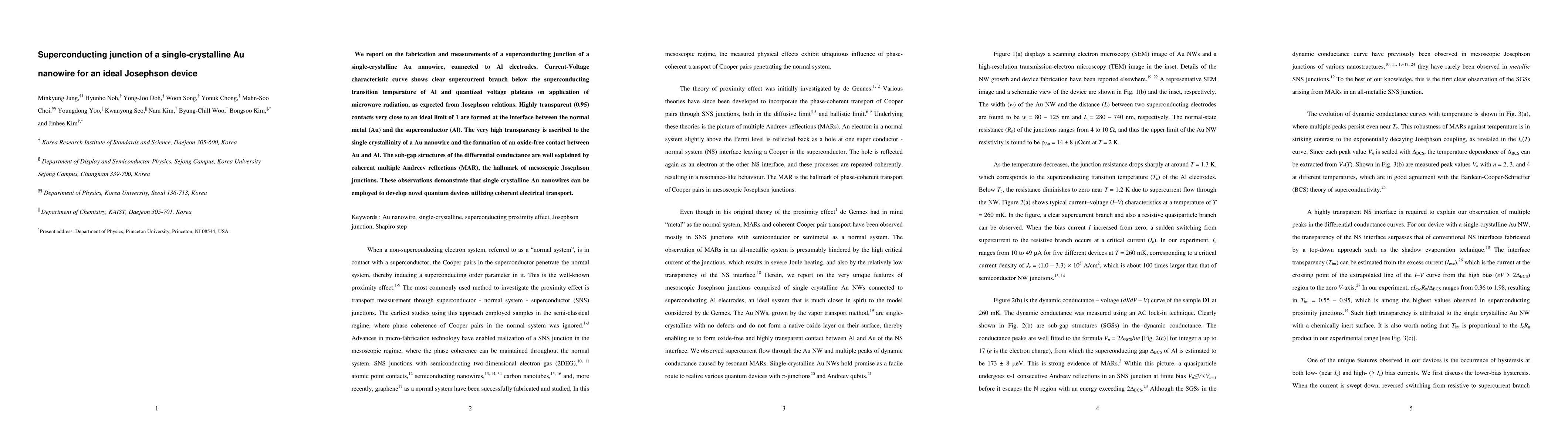 This paper reports on the fabrication of a superconducting junction using a single-crystalline Au nanowire connected to Al electrodes, showing ideal Josephson behavior with quantized voltage plateaus and high transparency contacts. The study highlights the potential of single-crystalline Au nanowires for developing advanced quantum devices.