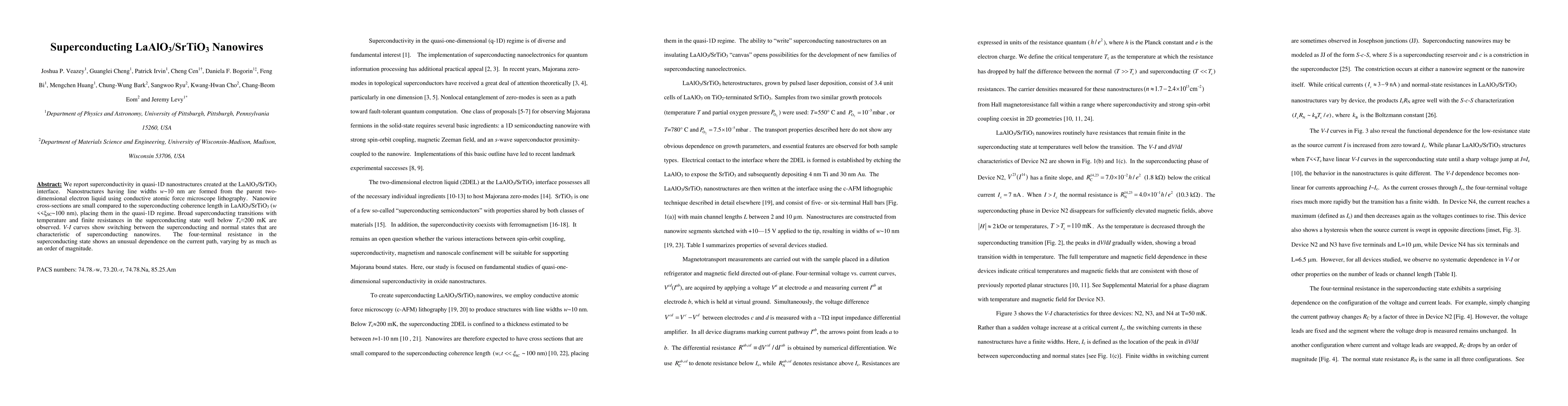 This paper investigates superconductivity in quasi-1D nanowires created at the LaAlO3/SrTiO3 interface using conductive atomic force microscope lithography, observing broad superconducting transitions and unusual four-terminal resistance dependence on current paths.