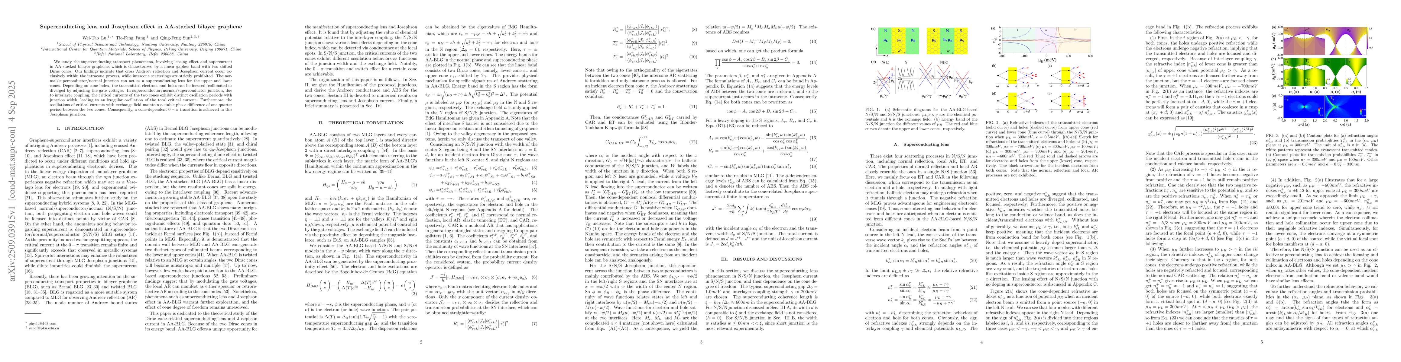 We study the superconducting transport phenomena, involving lensing effect and supercurrent in AA-stacked bilayer graphene, which is characterized by a linear gapless band with two shifted Dirac cones. Our findings indicate that cross Andreev reflection and Josephson current occur exclusively within the intracone process, while intercone scatterings are strictly prohibited. The normal/superconductor/normal junction can act as a superconducting lens for the upper and lower cones. Depending on cone index, the transmitted electrons and holes can be focused, collimated or diverged by adjusting the gate voltages. In superconductor/normal/superconductor junction, due to interlayer coupling, the critical currents of the two cones exhibit distinct oscillation periods with junction width, leading to an irregular oscillation of the total critical current. Furthermore, the oscillations of critical currents with exchange field maintain a stable phase difference of one quarter period between the two cones. Consequently, a cone-dependent 0-\pi transition is achieved in this Josephson junction.