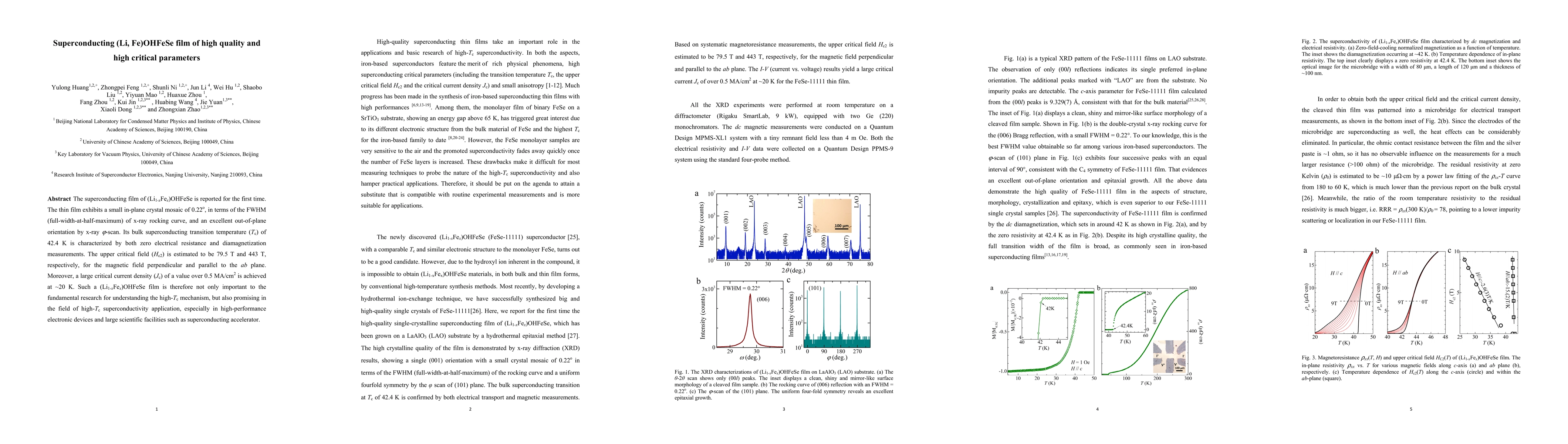 Researchers created a superconducting film of (Li, Fe)OHFeSe with high critical parameters, including a transition temperature of 42.4 K and a high upper critical field of up to 443 T.
