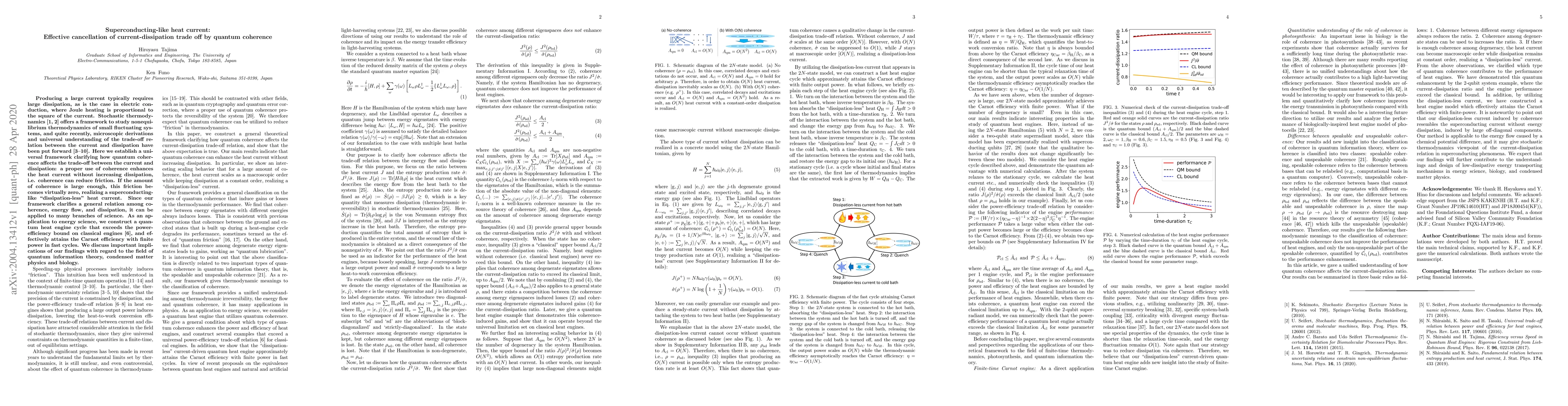 This paper establishes a framework showing how quantum coherence can effectively cancel the current-dissipation trade-off, enabling a superconducting-like dissipation-less heat current. It also proposes a quantum heat engine cycle that surpasses classical efficiency limits, with significant implications for quantum information theory, condensed matter physics, and biology.