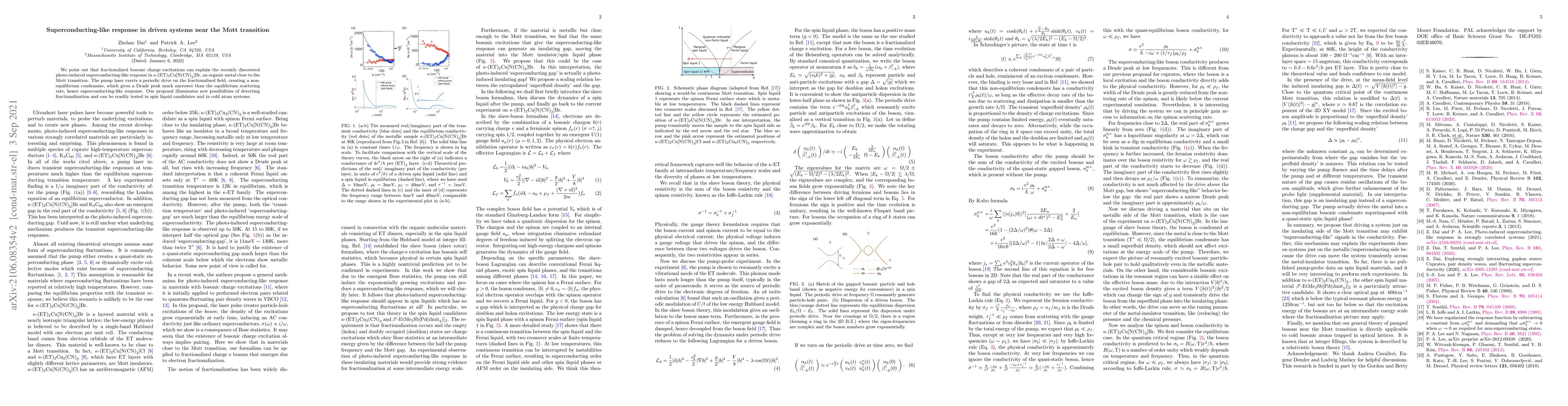 This paper explains the photo-induced superconducting-like response in an organic metal near the Mott transition by attributing it to fractionalized bosonic charge excitations. The pump laser creates a non-equilibrium condensate, leading to a narrow Drude peak, and offers a method to detect fractionalization applicable to spin liquids and cold atom systems.