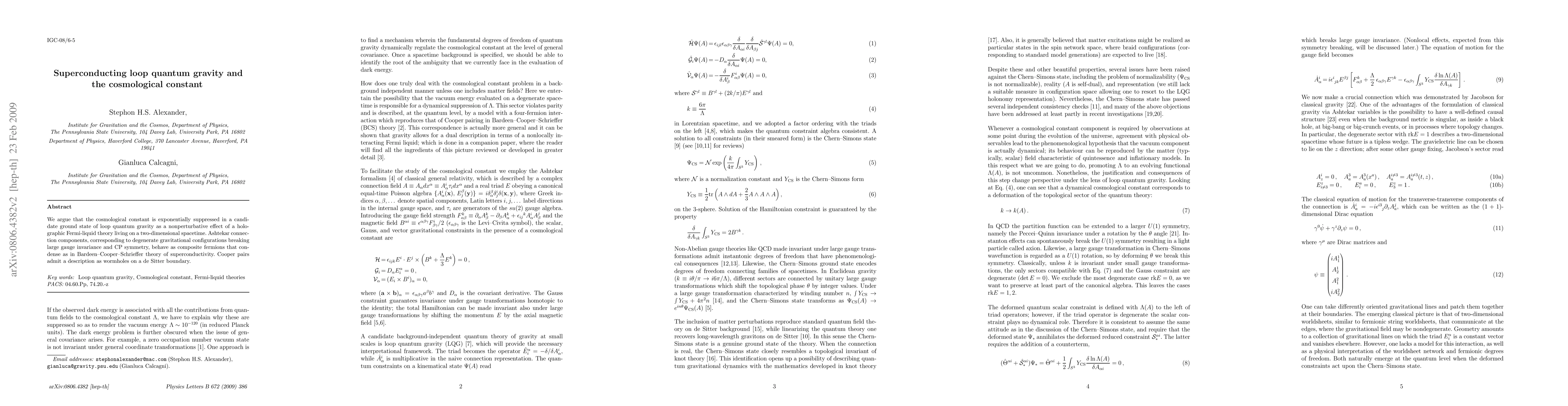 We argue that the cosmological constant is exponentially suppressed in a candidate ground state of loop quantum gravity as a nonperturbative effect of a holographic Fermi-liquid theory living on a two-dimensional spacetime. Ashtekar connection components, corresponding to degenerate gravitational configurations breaking large gauge invariance and CP symmetry, behave as composite fermions that condense as in Bardeen-Cooper-Schrieffer theory of superconductivity. Cooper pairs admit a description as wormholes on a de Sitter boundary.