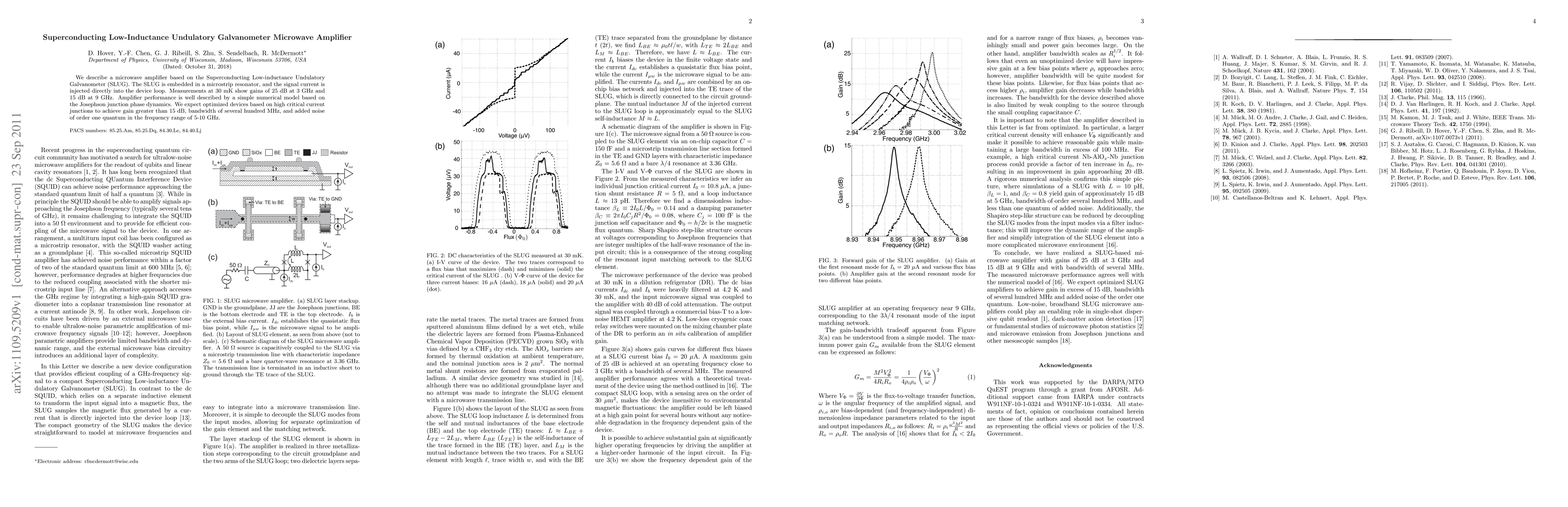 This paper presents a superconducting microwave amplifier utilizing a Superconducting Low-inductance Undulatory Galvanometer (SLUG) embedded in a microstrip resonator, achieving gains of 25 dB at 3 GHz and 15 dB at 9 GHz. The performance is modeled by Josephson junction dynamics, with potential for higher gain and lower noise in optimized designs.