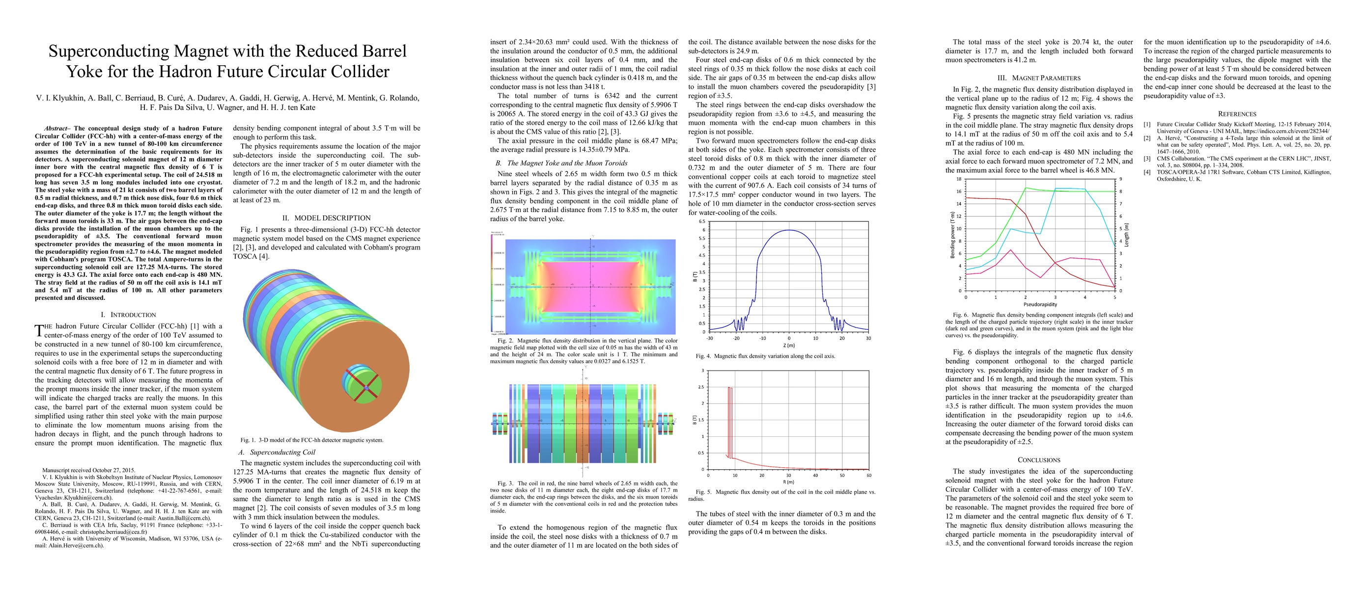 The conceptual design study of a hadron Future Circular Collider (FCC-hh) with a center-of-mass energy of the order of 100 TeV in a new tunnel of 80-100 km circumference assumes the determination of the basic requirements for its detectors. A superconducting solenoid magnet of 12 m diameter inner bore with the central magnetic flux density of 6 T is proposed for a FCC-hh experimental setup. The coil of 24.518 m long has seven 3.5 m long modules included into one cryostat. The steel yoke with a mass of 21 kt consists of two barrel layers of 0.5 m radial thickness, and 0.7 m thick nose disk, four 0.6 m thick end-cap disks, and three 0.8 m thick muon toroid disks each side. The outer diameter of the yoke is 17.7 m; the length without the forward muon toroids is 33 m. The air gaps between the end-cap disks provide the installation of the muon chambers up to the pseudorapidity of \pm 3.5. The conventional forward muon spectrometer provides the measuring of the muon momenta in the pseudorapidity region from \pm 2.7 to \pm 4.6. The magnet modeled with Cobham's program TOSCA. The total Ampere-turns in the superconducting solenoid coil are 127.25 MA-turns. The stored energy is 43.3 GJ. The axial force onto each end-cap is 480 MN. The stray field at the radius of 50 m off the coil axis is 14.1 mT and 5.4 mT at the radius of 100 m. All other parameters presented and discussed.