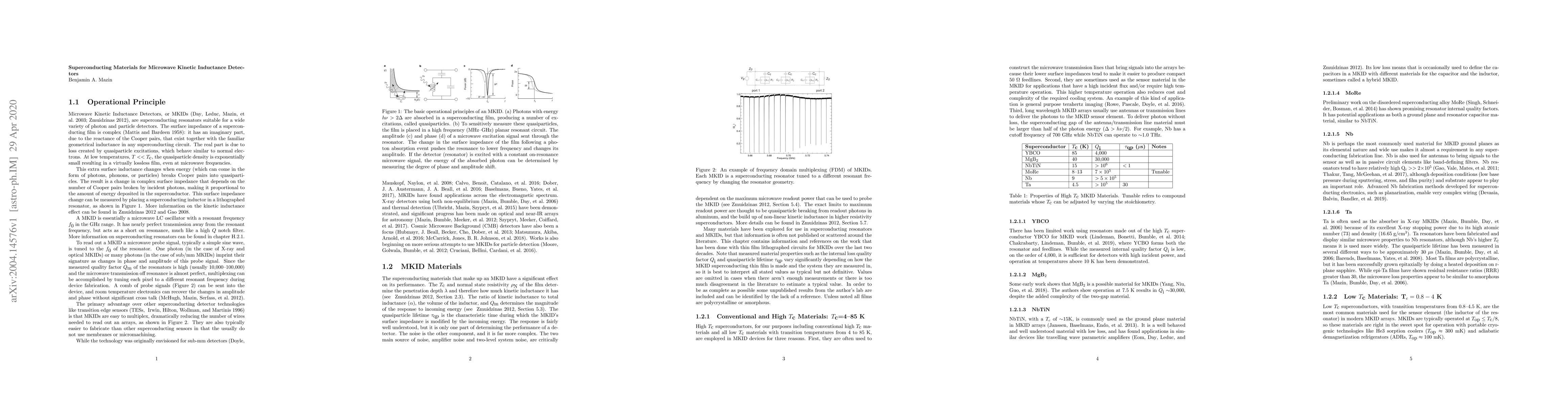 The superconducting materials that make up an MKID have a significant effect on its performance. The $T_\textrm{c}$ and normal state resistivity $\rho_\textrm{N}$ of the film determine the penetration depth $\lambda$ and therefore how much kinetic inductance it has. The ratio of kinetic inductance to total inductance ($\alpha$), the volume of the inductor, and $Q_\textrm{m}$ determines the magnitude of the response to incoming energy. The quasiparticle lifetime $\tau_\textrm{qp}$ is the characteristic time during which the MKID's surface impedance is modified by the incoming energy. Many materials have been explored for use in superconducting resonators and MKIDs, but that information is often not published or scattered around the literature. This chapter contains information and references on the work that has been done with thin film lithographed circuits for MKIDs over the last two decades. Note that measured material properties such as the internal loss quality factor $Q_\textrm{i}$ and quasiparticle lifetime $\tau_\textrm{qp}$ vary significantly depending on how the MKID superconducting thin film is made and the system they are measured in, so it is best to interpret all stated values as typical but not definitive. Values are omitted in cases when there aren't enough measurements or there is too much disagreement in the literature to estimate a typical value. In order to be as complete as possible some unpublished results from the author's lab are included and can be identified by the lack of a reference. Unless noted all films are polycrystalline or amorphous.