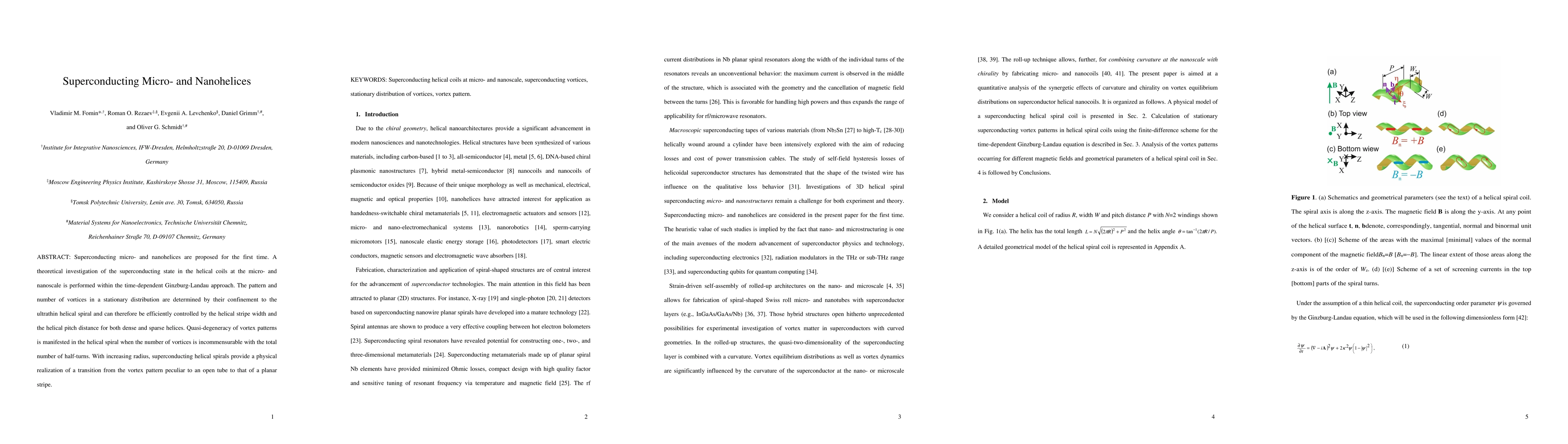 Superconducting micro- and nanohelices are proposed for the first time. A theoretical investigation of the superconducting state in the helical coils at the micro- and nanoscale is performed within the time-dependent Ginzburg-Landau approach. The pattern and number of vortices in a stationary distribution are determined by their confinement to the ultrathin helical spiral and can therefore be efficiently controlled by the helical stripe width and the helical pitch distance for both dense and sparse helices. Quasi-degeneracy of vortex patterns is manifested in the helical spiral when the number of vortices is incommensurable with the total number of half-turns. With increasing radius, superconducting helical spirals provide a physical realization of a transition from the vortex pattern peculiar to an open tube to that of a planar stripe.
