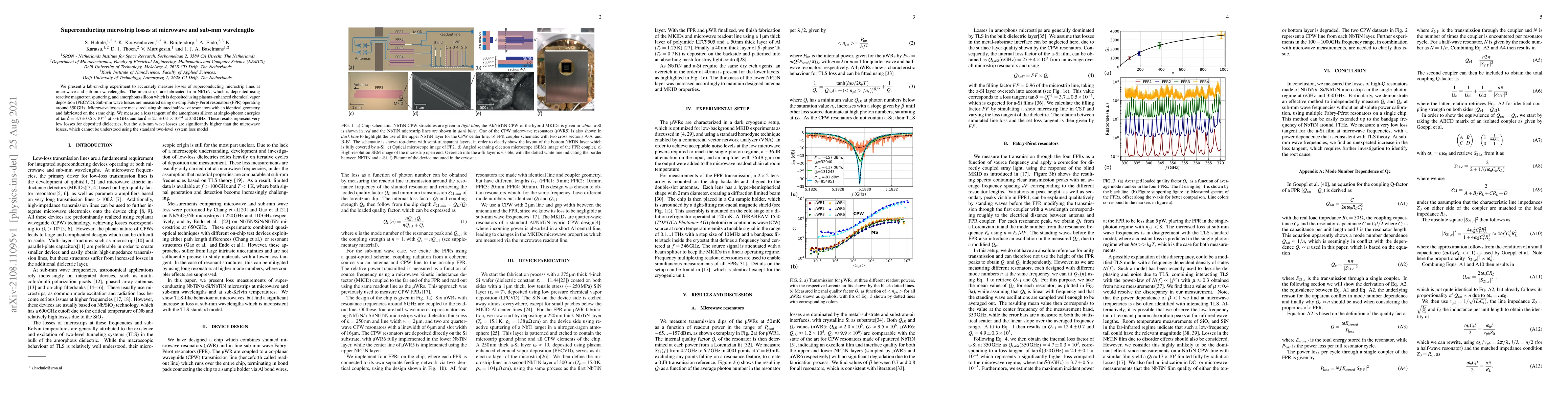 This study measures the losses of superconducting microstrip lines made from NbTiN and amorphous silicon at microwave and sub-millimeter wavelengths, finding very low losses for the dielectric but higher losses at sub-millimeter wavelengths than expected, challenging the standard loss model.