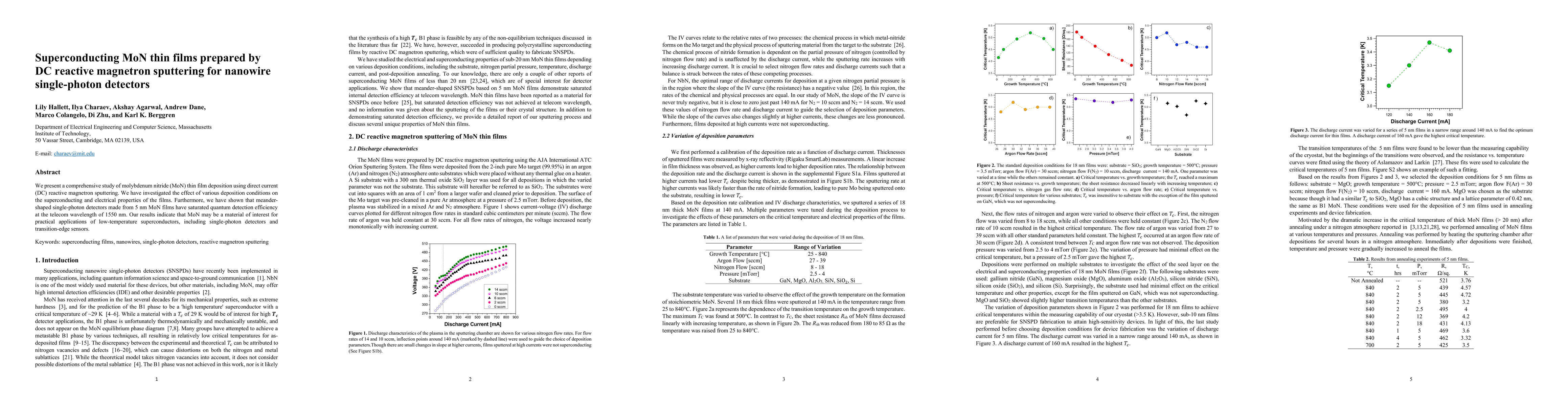 This study investigates the deposition of superconducting molybdenum nitride (MoN) thin films via DC reactive magnetron sputtering, examining the effects of various conditions on their properties. The research demonstrates that MoN films can form efficient meander-shaped single-photon detectors with high quantum detection efficiency at 1550 nm, suggesting potential for low-temperature superconductor applications.