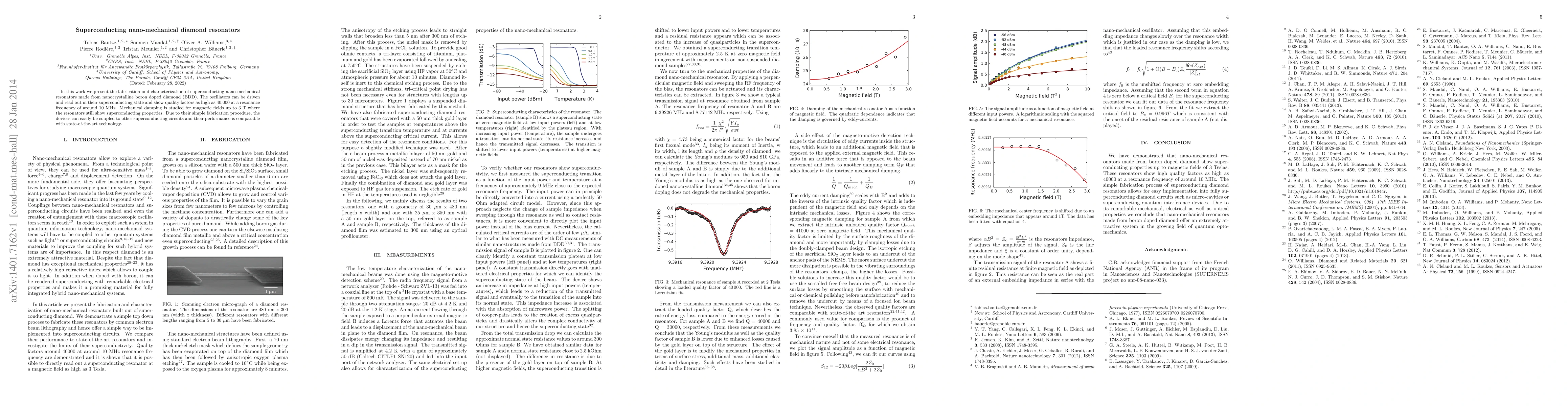 This paper details the fabrication and characterization of superconducting nano-mechanical resonators made from nanocrystalline boron-doped diamond, achieving high quality factors of up to 40,000 at 10 MHz, while maintaining superconducting properties under magnetic fields up to 3 T.