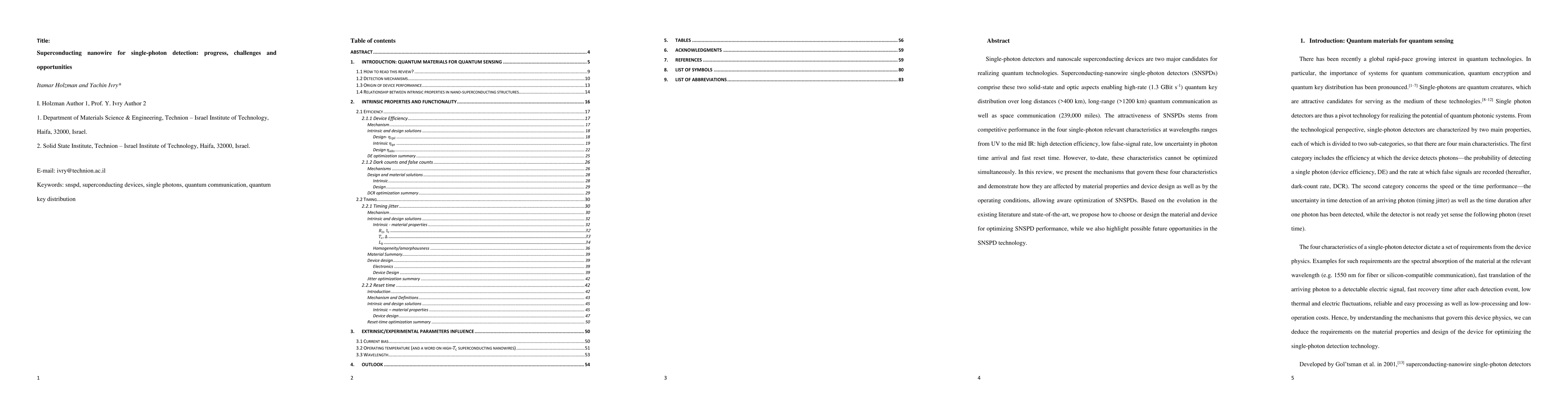 This paper reviews the progress, challenges, and opportunities in superconducting nanowire single-photon detectors (SNSPDs), highlighting their potential for quantum technologies. It discusses the mechanisms affecting key performance characteristics and offers guidance on optimizing material and device design for enhanced SNSPD performance.