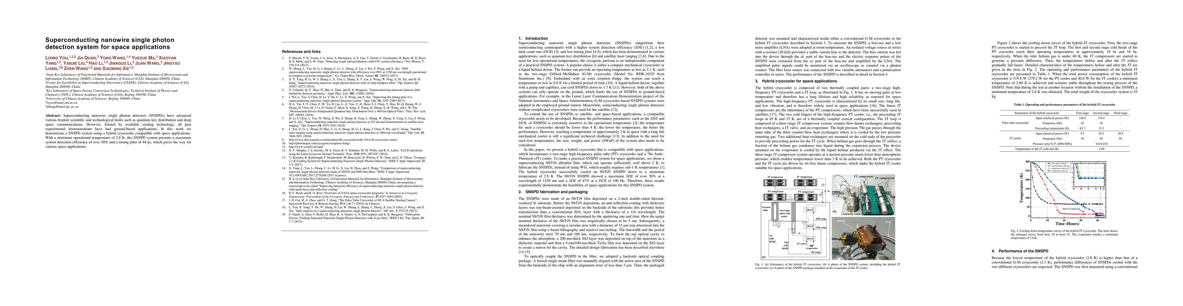 This paper presents a superconducting nanowire single photon detector (SNSPD) system compatible with space applications, utilizing a hybrid cryocooler to achieve a minimum operational temperature of 2.8 K. The system demonstrates a detection efficiency over 50% and a timing jitter of 48 ps, enabling potential advancements in quantum key distribution and deep space communications.
