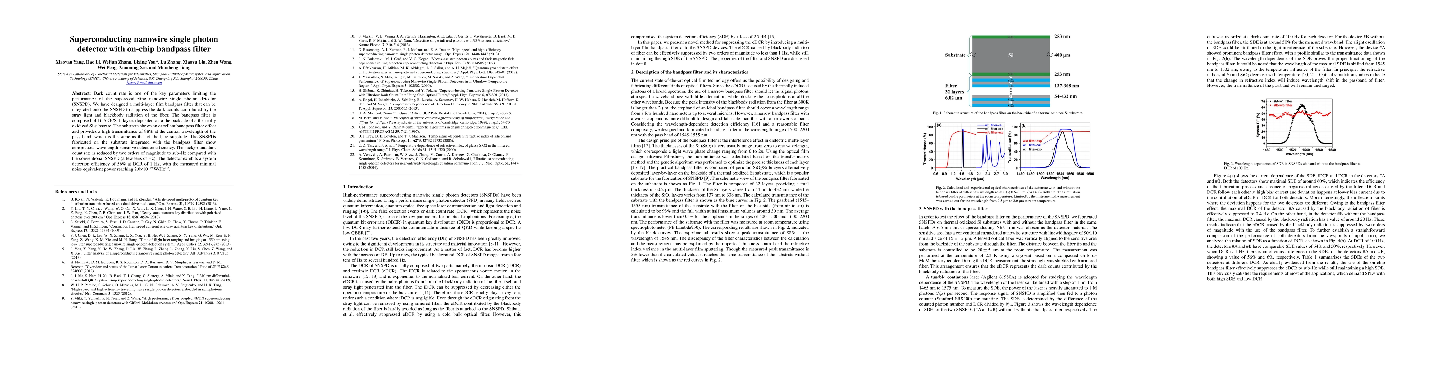 This paper presents a superconducting nanowire single photon detector (SNSPD) integrated with an on-chip bandpass filter to significantly reduce dark count rates. The filter, composed of 16 SiO2/Si bilayers, suppresses stray light and blackbody radiation, achieving a two-order reduction in dark counts to sub-Hz levels.