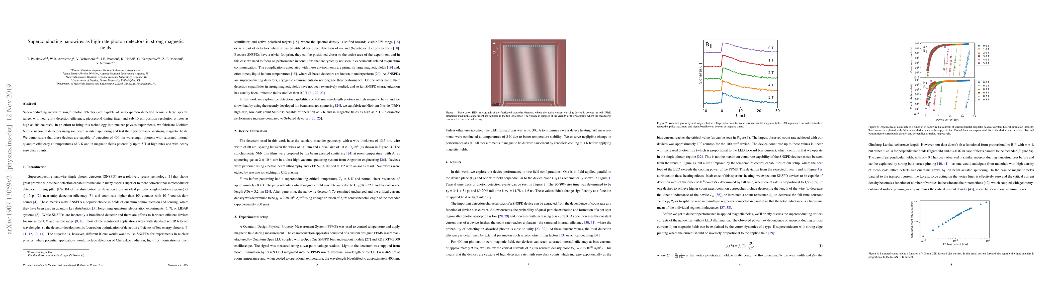 Superconducting nanowire detectors made from Niobium Nitride exhibit high-rate single-photon detection capabilities, maintaining near-unity efficiency and minimal dark counts even in strong magnetic fields up to 5 T. These devices show promise for applications in nuclear physics experiments.