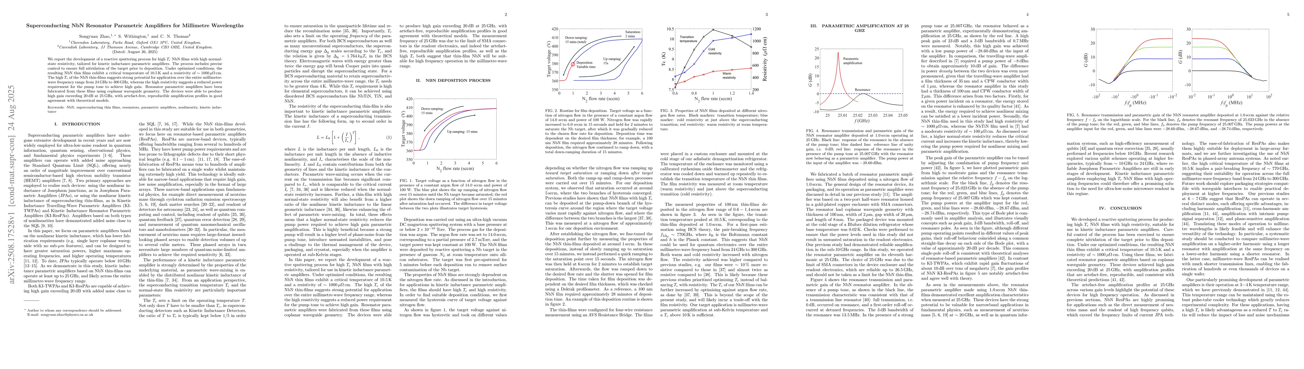 We report the development of a reactive sputtering process for high $T_\mathrm{c}$ NbN films with high normal-state resistivity, tailored for kinetic inductance parametric amplifiers. The process includes precise control to ensure full nitridation of the target prior to deposition. Under optimized conditions, the resulting NbN thin films exhibit a critical temperature of $10.5\,\mathrm{K}$ and a resistivity of $\sim1000\,\mathrm{\mu\Omega\,cm}$. The high $T_\mathrm{c}$ of the NbN thin-films suggests strong potential for application over the entire millimetre-wave frequency range from $24\,\mathrm{GHz}$ to $300\,\mathrm{GHz}$, whereas the high resistivity suggests a reduced power requirement for the pump tone to achieve high gain. Resonator parametric amplifiers have been fabricated from these films using coplanar waveguide geometry. The devices were able to produce high gain exceeding $20\,\mathrm{dB}$ at $25\,\mathrm{GHz}$, with artefact-free, reproducible amplification profiles in good agreement with theoretical models.