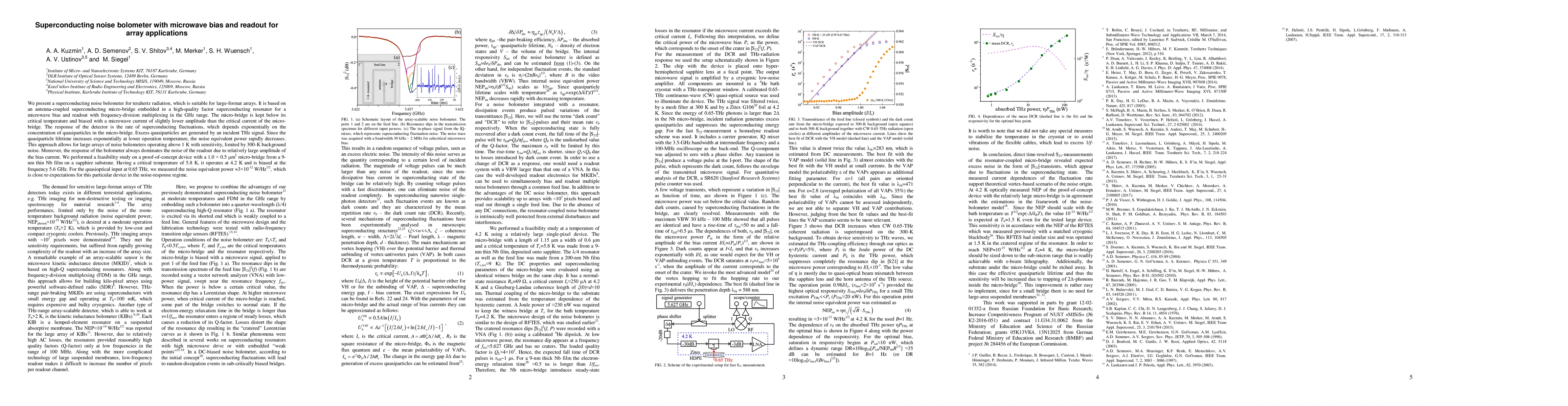 We present a superconducting noise bolometer for terahertz radiation, which is suitable for large-format arrays. It is based on an antenna-coupled superconducting micro-bridge embedded in a high-quality factor superconducting resonator for a microwave bias and readout with frequency-division multiplexing in the GHz range. The micro-bridge is kept below its critical temperature and biased with a microwave current of slightly lower amplitude than the critical current of the micro-bridge. The response of the detector is the rate of superconducting fluctuations, which depends exponentially on the concentration of quasiparticles in the micro-bridge. Excess quasiparticles are generated by an incident THz signal. Since the quasiparticle lifetime increases exponentially at lower operation temperature, the noise equivalent power rapidly decreases. This approach allows for large arrays of noise bolometers operating above 1 K with sensitivity, limited by 300-K background noise. Moreover, the response of the bolometer always dominates the noise of the readout due to relatively large amplitude of the bias current. We performed a feasibility study on a proof-of-concept device with a ${1.0\times 0.5 \rm \mu m^{2}}$ micro-bridge from a 9-nm thin Nb film on a sapphire substrate. Having a critical temperature of 5.8 K, it operates at 4.2 K and is biased at the frequency 5.6 GHz. For the quasioptical input at 0.65 THz, we measured the noise equivalent power ${\approx 3\times 10^{-12}\rm W/\sqrt Hz}$ , which is close to expectations for this particular device in the noise-response regime.