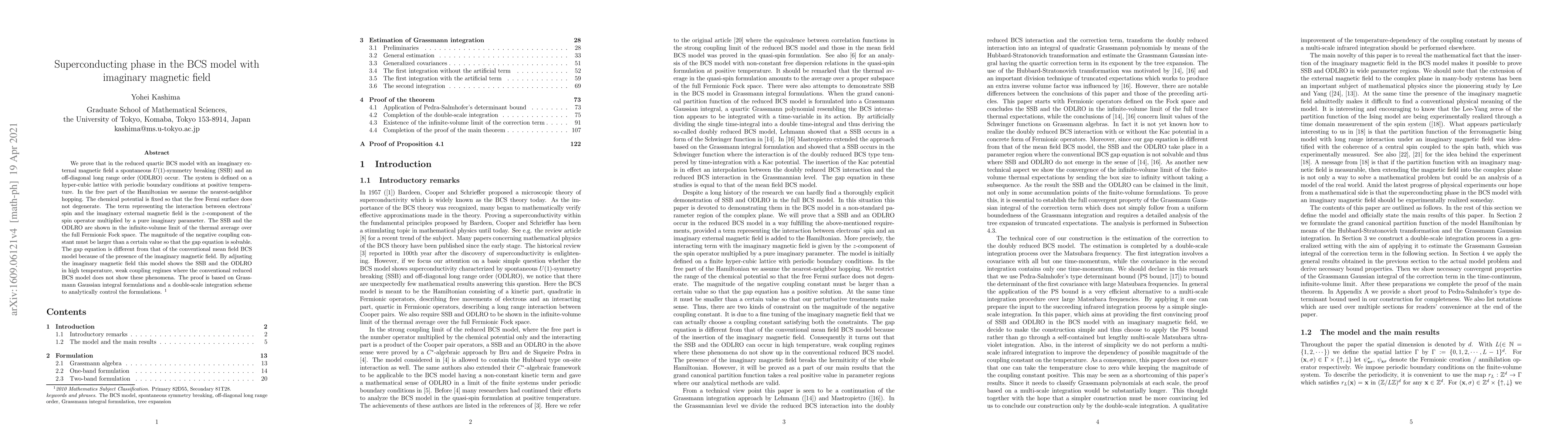 This paper demonstrates that an imaginary magnetic field in the BCS model induces spontaneous U(1)-symmetry breaking and off-diagonal long-range order at high temperature and weak coupling, where conventional BCS models fail to show these phenomena. The analysis employs Grassmann Gaussian integrals and a double-scale integration scheme to prove these effects.