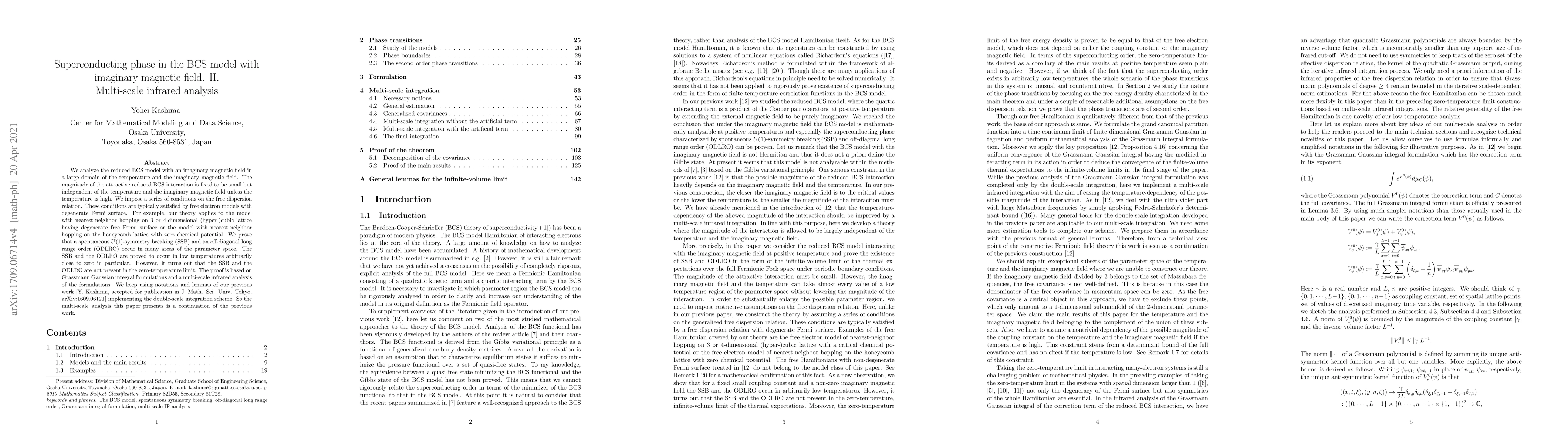 We analyze the reduced BCS model with an imaginary magnetic field in a large domain of the temperature and the imaginary magnetic field. The magnitude of the attractive reduced BCS interaction is fixed to be small but independent of the temperature and the imaginary magnetic field unless the temperature is high. We impose a series of conditions on the free dispersion relation. These conditions are typically satisfied by free electron models with degenerate Fermi surface. For example, our theory applies to the model with nearest-neighbor hopping on 3 or 4-dimensional (hyper-)cubic lattice having degenerate free Fermi surface or the model with nearest-neighbor hopping on the honeycomb lattice with zero chemical potential. We prove that a spontaneous U(1)-symmetry breaking (SSB) and an off-diagonal long range order (ODLRO) occur in many areas of the parameter space. The SSB and the ODLRO are proved to occur in low temperatures arbitrarily close to zero in particular. However, it turns out that the SSB and the ODLRO are not present in the zero-temperature limit. The proof is based on Grassmann Gaussian integral formulations and a multi-scale infrared analysis of the formulations. We keep using notations and lemmas of our previous work [Y. Kashima, accepted for publication in J. Math. Sci. Univ. Tokyo, arXiv:1609.06121] implementing the double-scale integration scheme. So the multi-scale analysis this paper presents is a continuation of the previous work.