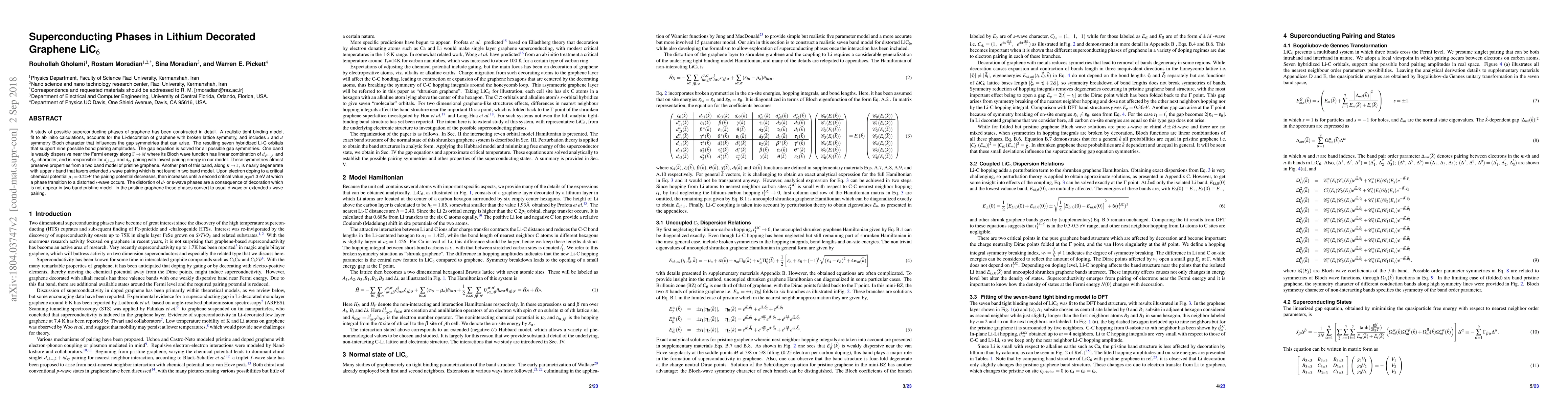 A study of possible superconducting phases of graphene has been constructed in detail. A realistic tight binding model, fit to ab initio calculations, accounts for the Li-decoration of graphene with broken lattice symmetry, and includes $s$ and $d$ symmetry Bloch character that influences the gap symmetries that can arise. The resulting seven hybridized Li-C orbitals that support nine possible bond pairing amplitudes. The gap equation is solved for all possible gap symmetries. One band is weakly dispersive near the Fermi energy along $\Gamma\rightarrow M$ where its Bloch wave function has linear combination of $d_{x^2-y^2}$ and $d_{xy}$ character, and is responsible for $ d_{x^{2}-y^{2}}$ and $d_{xy}$ pairing with lowest pairing energy in our model. These symmetries almost preserve properties from a two band model of pristine graphene. Another part of this band, along $K\rightarrow \Gamma$, is nearly degenerate with upper $s$ band that favors extended $s$ wave pairing which is not found in two band model. Upon electron doping to a critical chemical potential $\mu_1=0.22 eV$ the pairing potential decreases, then increases until a second critical value $\mu_2$=1.3 eV at which a phase transition to a new phase which is not appear in two band model. This phase in the pristine graphene converts to usual extended s-wave pairing.